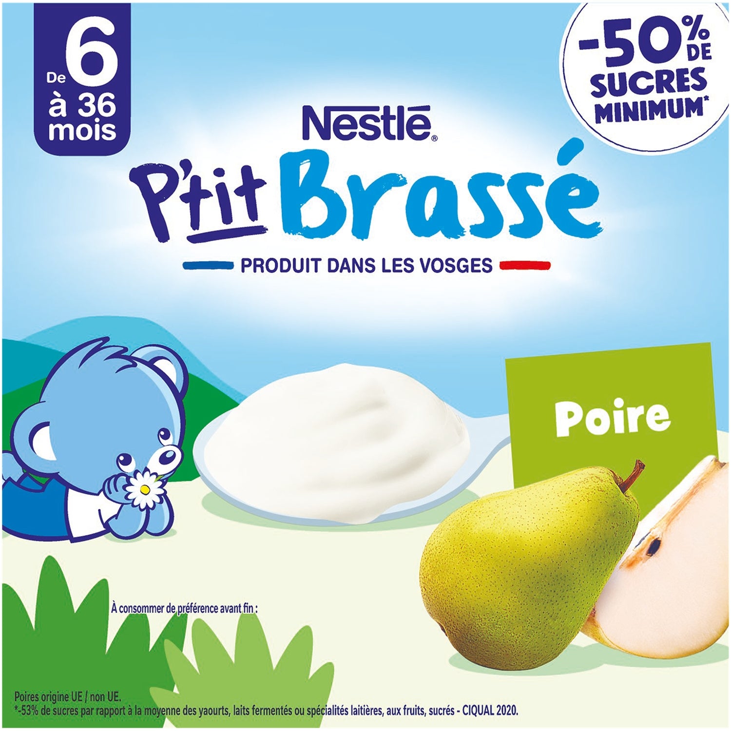 P'tit Brassé à la Poire, le laitage conçu exprès pour bébé* -50% de sucres minimum **. Produit dans les Vosges. Savoureux, ce laitage pour bébé dès l'âge de 6 mois se donne au goûter ou au dessert. Pratique pour les parents, ce petit pot destiné à bébé vous accompagne partout car jusqu'à son ouverture, il peut être conservé à température ambiante et non pas au frigo.*Conformément à la réglementation sur les aliments pour bébés. **- 53% Par rapport à la moyenne des yaourts, laits fermentés ou spécialités laitières aux fruits, sucrés - Ciqual 2020. Poire origine UE/Non UE.