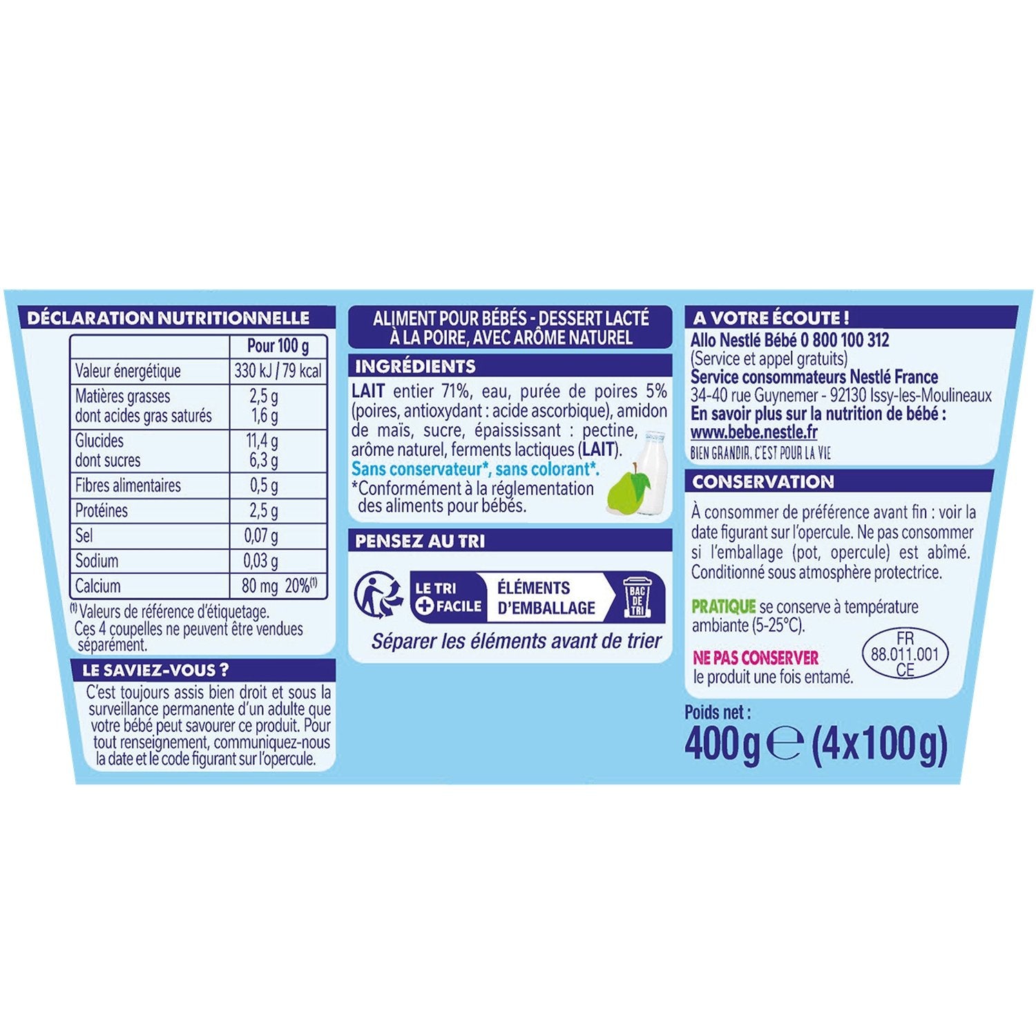 Ingrédients : LAIT entier 71%, eau, purée de poires 5% (poires, antioxydant : acide ascorbique), amidon de maïs, sucre, épaississant : pectine, arôme naturel, ferments lactiques (LAIT)