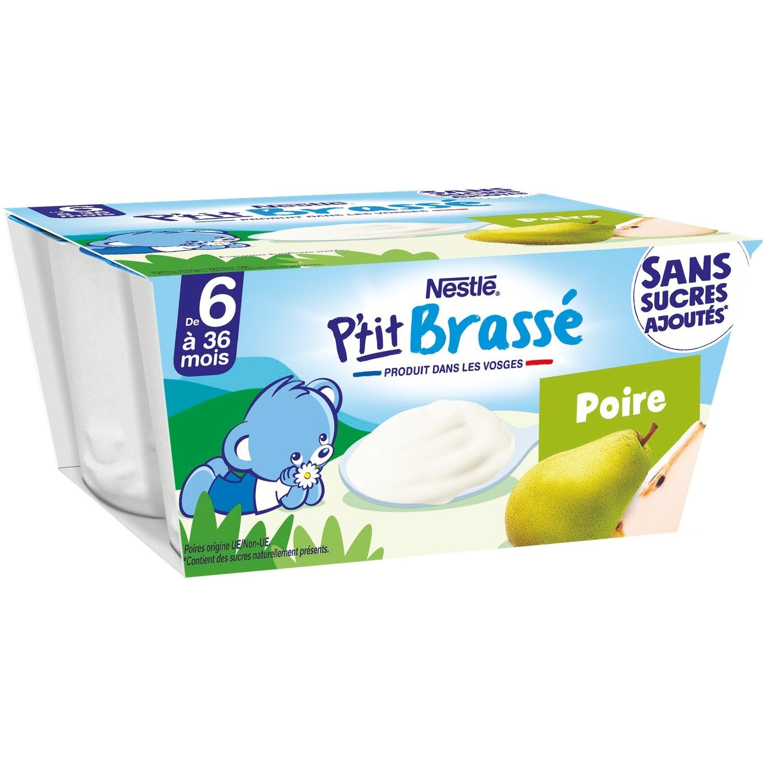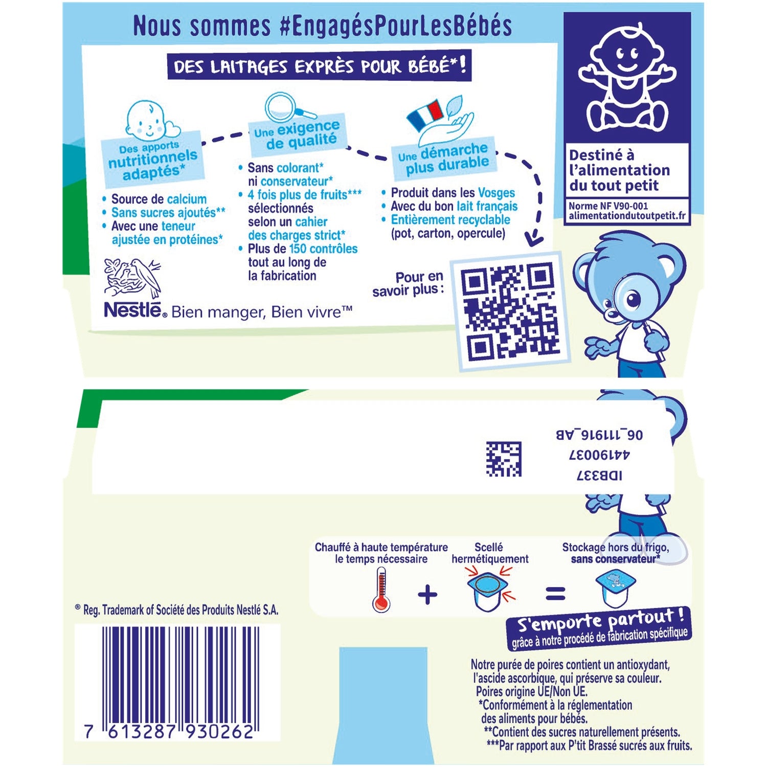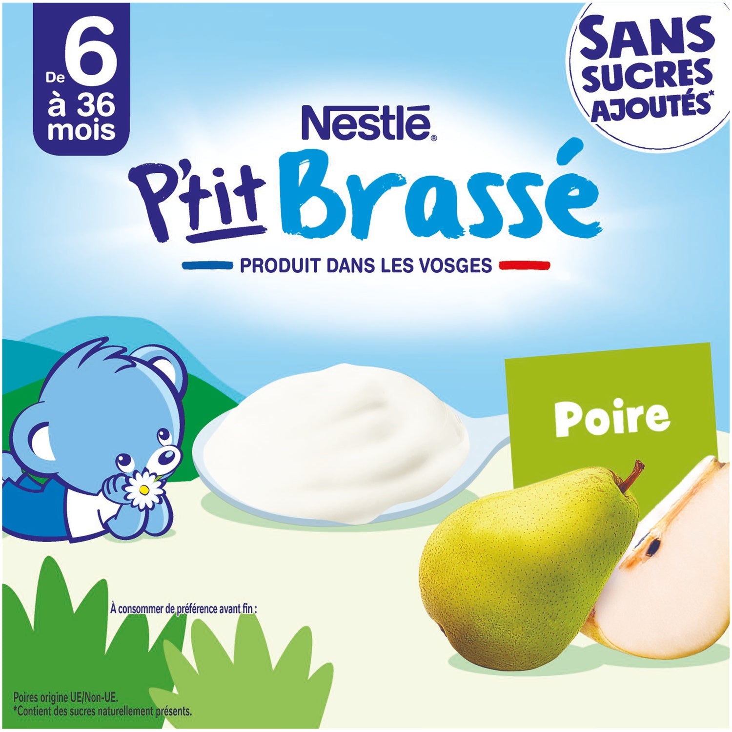 Sans sucres ajoutés* avec 5 fois plus de fruits**. *Contient des sucres naturellement présents. **Par rapport à la moyenne des P'tit brassé aux fruits sucrés.,Un laitage conçu exprès pour bébé***.,Source de calcium avec une teneur ajustée en protéines***. ***Conformément à la réglementation sur les aliments pour bébés.,Produit dans les Vosges avec du lait local****. ****Une majorité de notre lait provient de coopératives à moins de 200km de notre lieu de fabrication. Poire origine UE.,Cet emballage contient minimum 80% de carton recyclé et est recyclable.