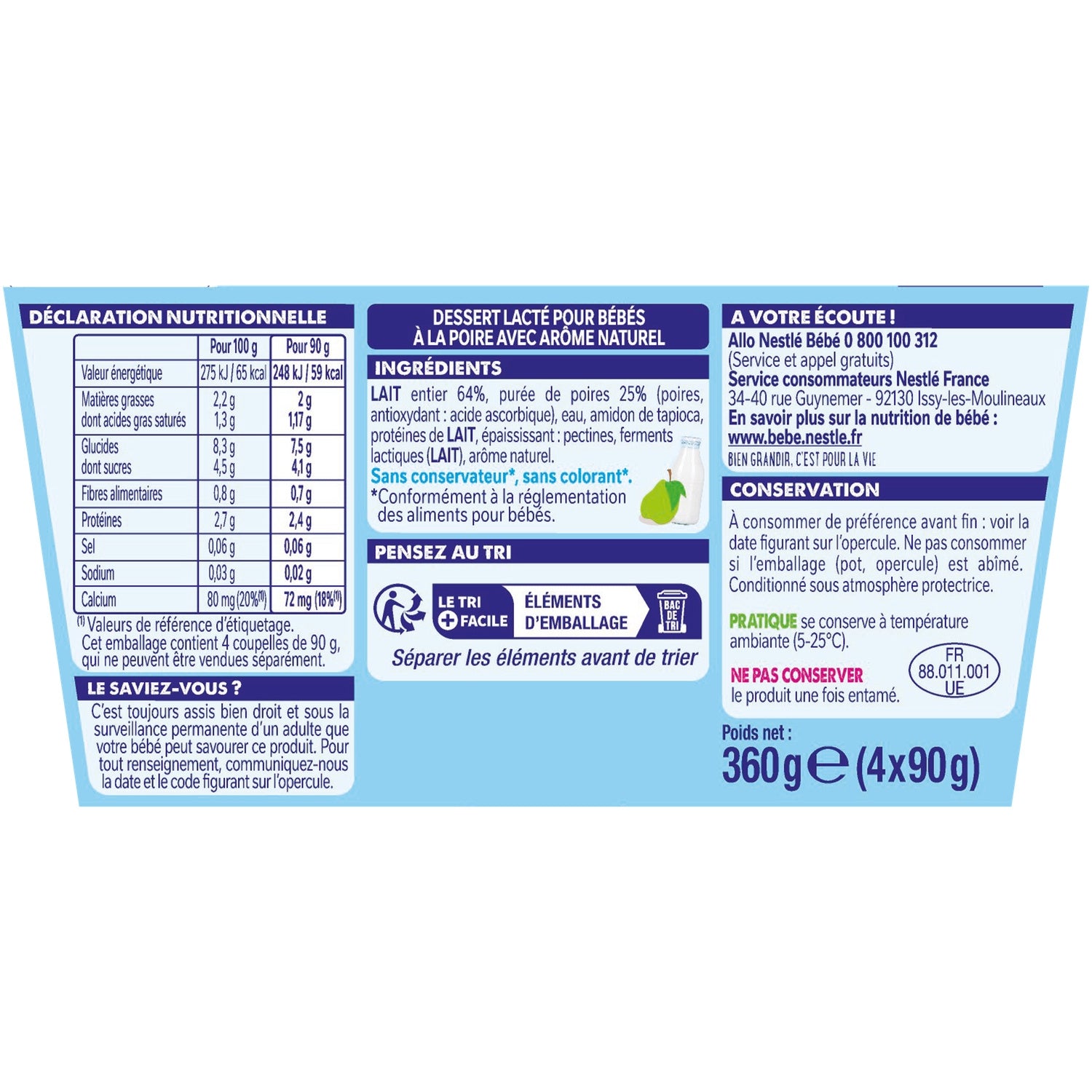 Ingrédients : LAIT entier 64%, purée de poires 25% (poires, antioxydant : acide ascorbique), eau, amidon de tapioca, protéines de LAIT, épaississant : pectines, ferments lactiques (LAIT), arôme naturel.