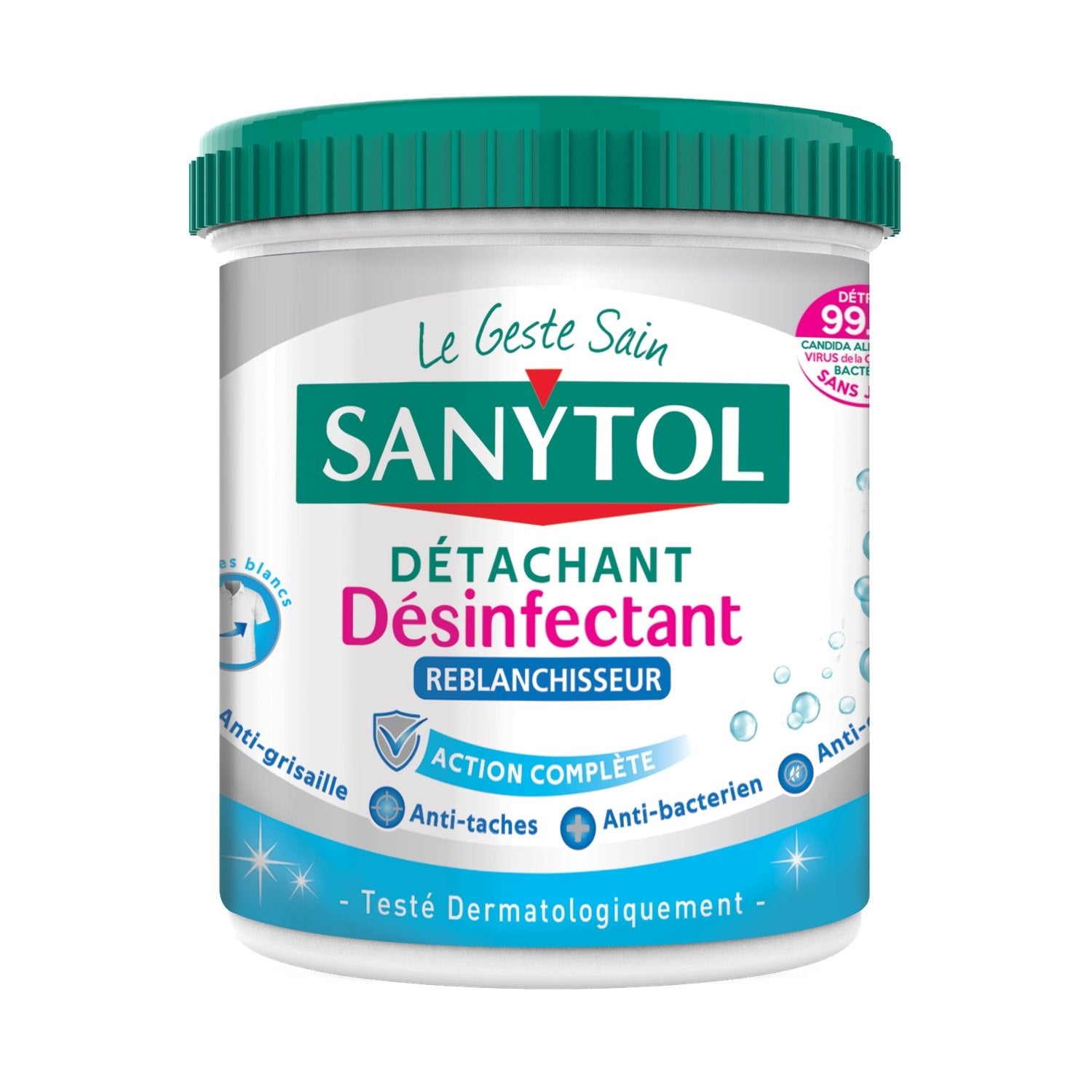 Le linge lavé à basse température n'est pas totalement débarrassé des microbes, pourtant à l'origine des mauvaises odeurs et des maladies ou irritations de la peau. Seul un lavage entre 60°C et 90°C permet d'éliminer tous les microbes sur le linge. SANYTOL, l'expert de la désinfection sans javel, a développé un détachant désinfectant reblanchisseur 'Action complète' qui élimine microbes, mauvaises odeurs et taches tenaces dès 30°C. Il reblanchit le linge lavage après lavage. Sa formule enrichie en enzymes pénètre au cœur des fibres textiles et libère des agents de détachage pour un résultat impeccable.