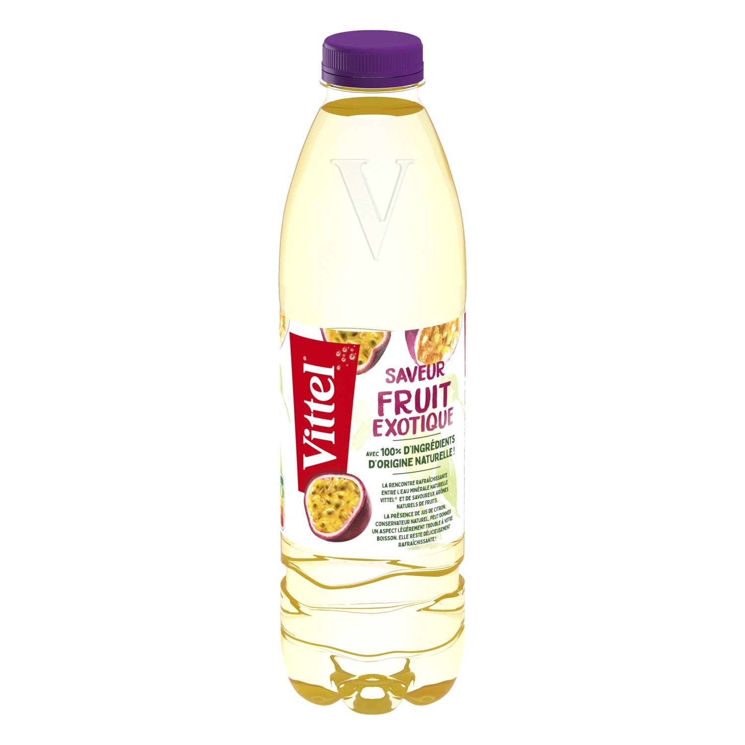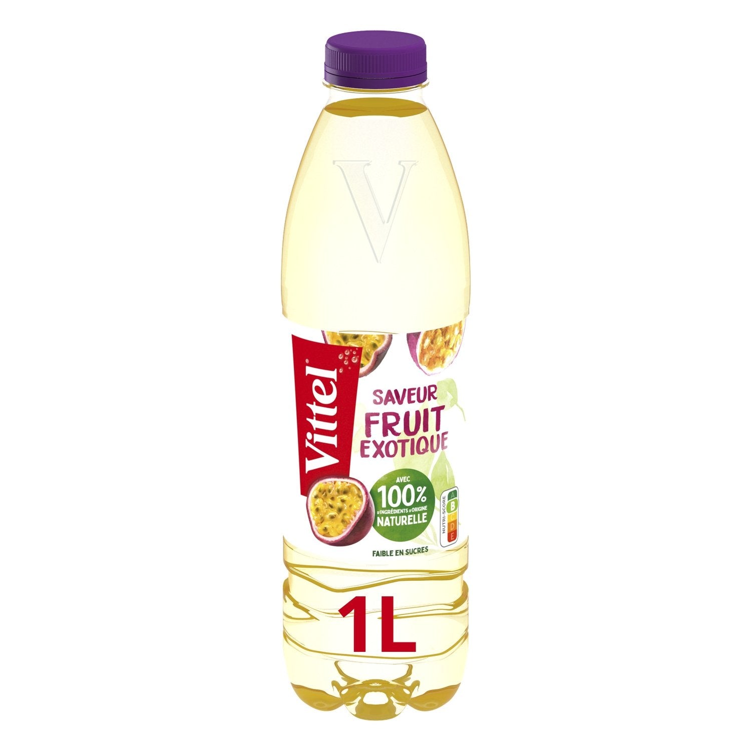 Goûtez notre nouvelle recette VITTEL® saveur Fruit exotique ! Découvrez la rencontre délicieusement rafraîchissante entre l'eau minérale naturelle VITTEL® et une touche d'arômes naturels de fruit de la passion. Le secret de notre recette ? 100% d'ingrédients d'origine naturelle ! Le tout, faible en calories et en sucres pour profiter d'une hydratation aux saveurs fruitées et d'un plaisir sain. Et ce n'est pas tout, sa bouteille est fabriquée en matière 100% recyclée grâce à vous qui triez, alors MERCI ! Découvrez aussi les autres arômes de notre gamme : Fraise, Citron-Citron Vert et Pêche Touche de Gingembre !