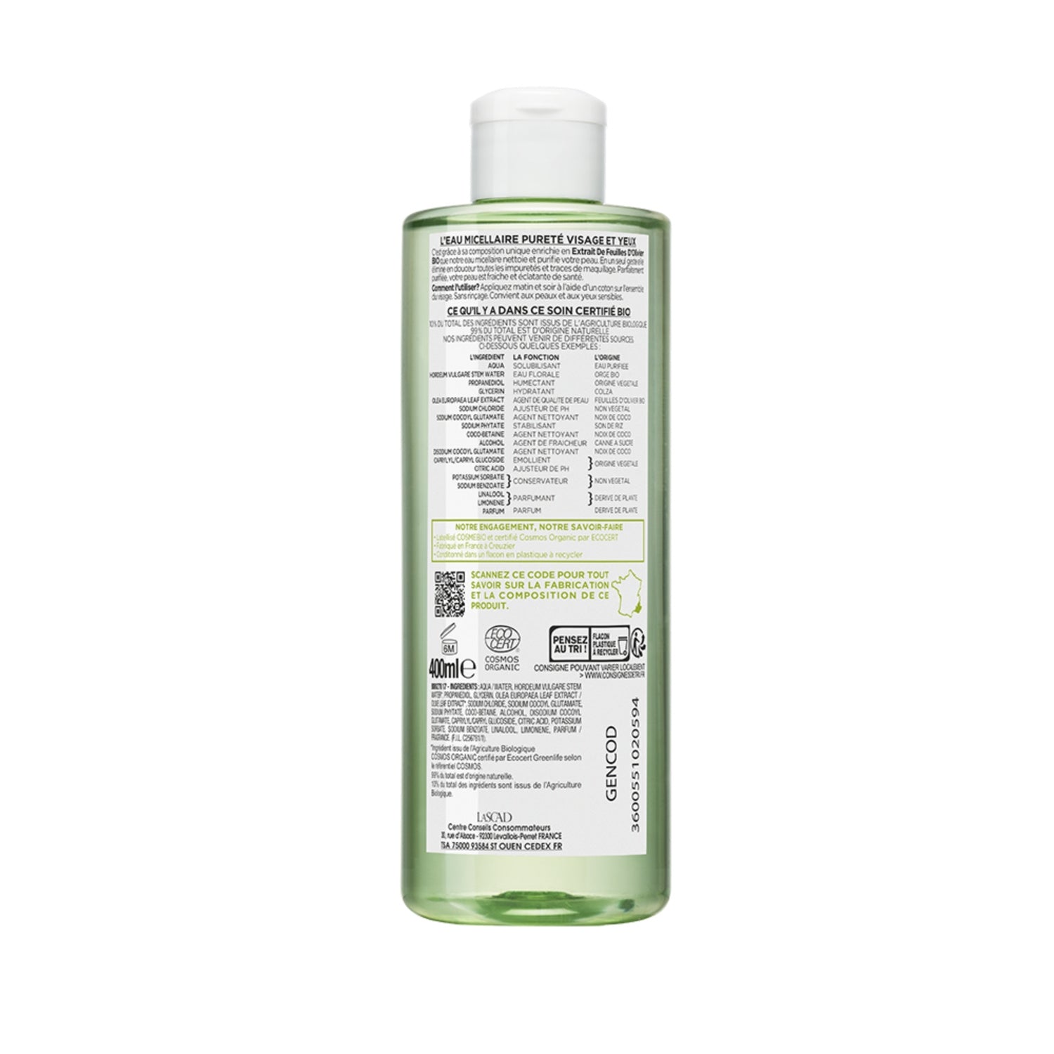 EAU MICELLAIRE PURETE ANTI-IMPURETES VISAGE & YEUX. Un démaquillage en douceur en un seul geste! LE POUVOIR DE L'OLIVE DANS UNE FORMULE A L'EFFICACITE PROUVEE Cette eau micellaire à l'efficacité prouvée est enrichie en Biophénols d'Olive. Elle nettoie et démaquille tous types de peaux, même sensibles. En un seul geste, elle élimine en douceur les impuretés et traces de maquillage. Parfaitement purifiée votre peau est fraiche et éclatante de santé. NETTOYAGE EN DOUCEUR & SENSORIALITE UNIQUE Formule douce sur la peau EAU MICELLAIRE CERTIFIEE BIO AVEC 99% D'INGREDIENTS D'ORIGINE NATURELLE Olives pressées au Moulin de la Balméenne REDECOUVREZ L'EAU MICELLAIRE PURETE L'Eau Micellaire Pureté se refait une beauté: une formule identique toujours aussi naturelle et performante, dans un nouveau flacon composé à 100% de plastique recyclé*. *Hors capsule, additifs et étiquettes • Nettoie et démaquille tous types de peaux même sensibles • Elimine en douceur les impuretés et tr