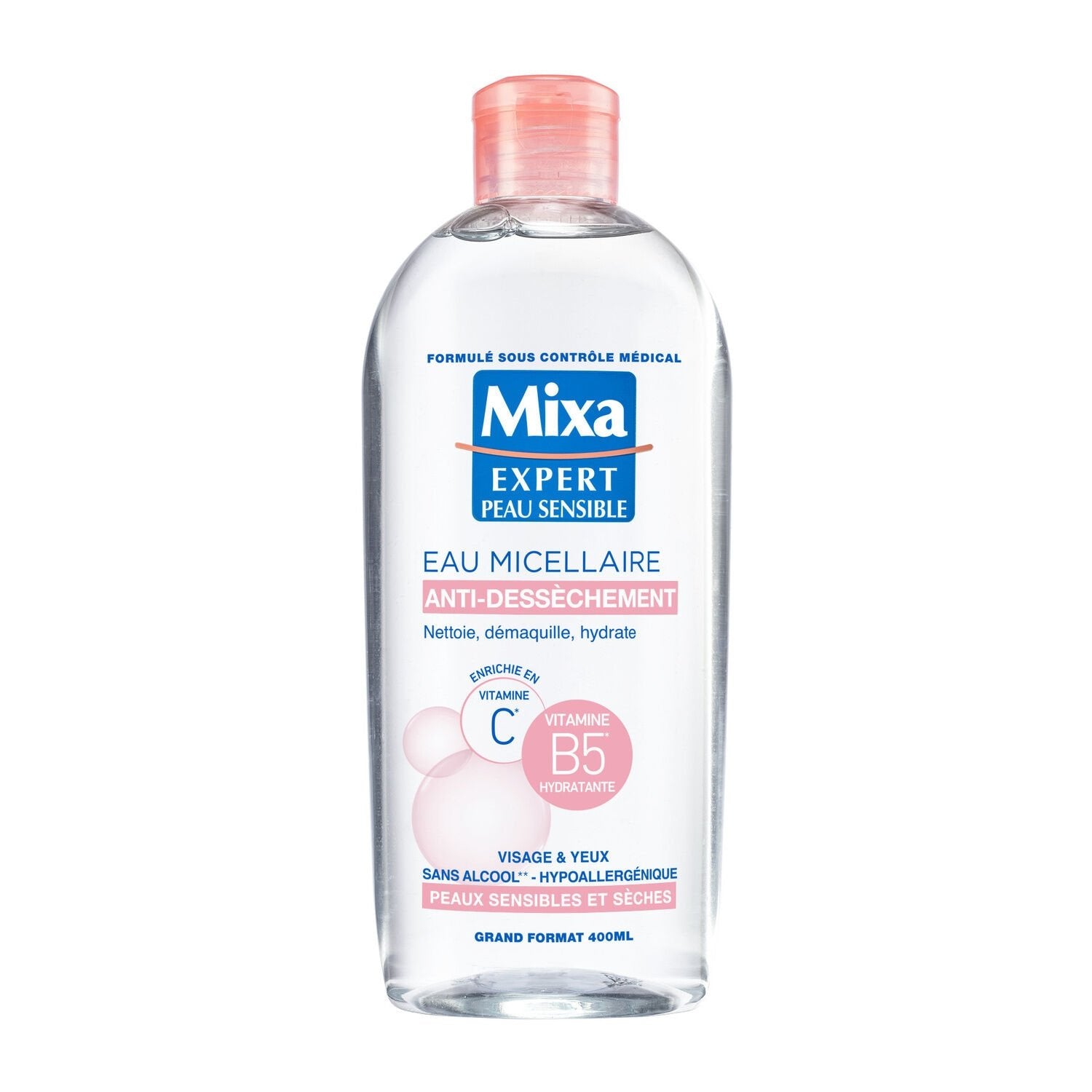 L'Eau Micellaire vitaminée Antidessèchement Mixa nettoie les peaux sensibles et sèches dans le plus grand respect. Sa formule capte et élimine en un seul geste le maquillage, les impuretés et les particules de pollution du visage et des yeux. Une action nettoyante et démaquillante, douce et non asséchante pour les peaux sensibles et sèches. La peau est réhydratée intensément, le teint semble plus frais.