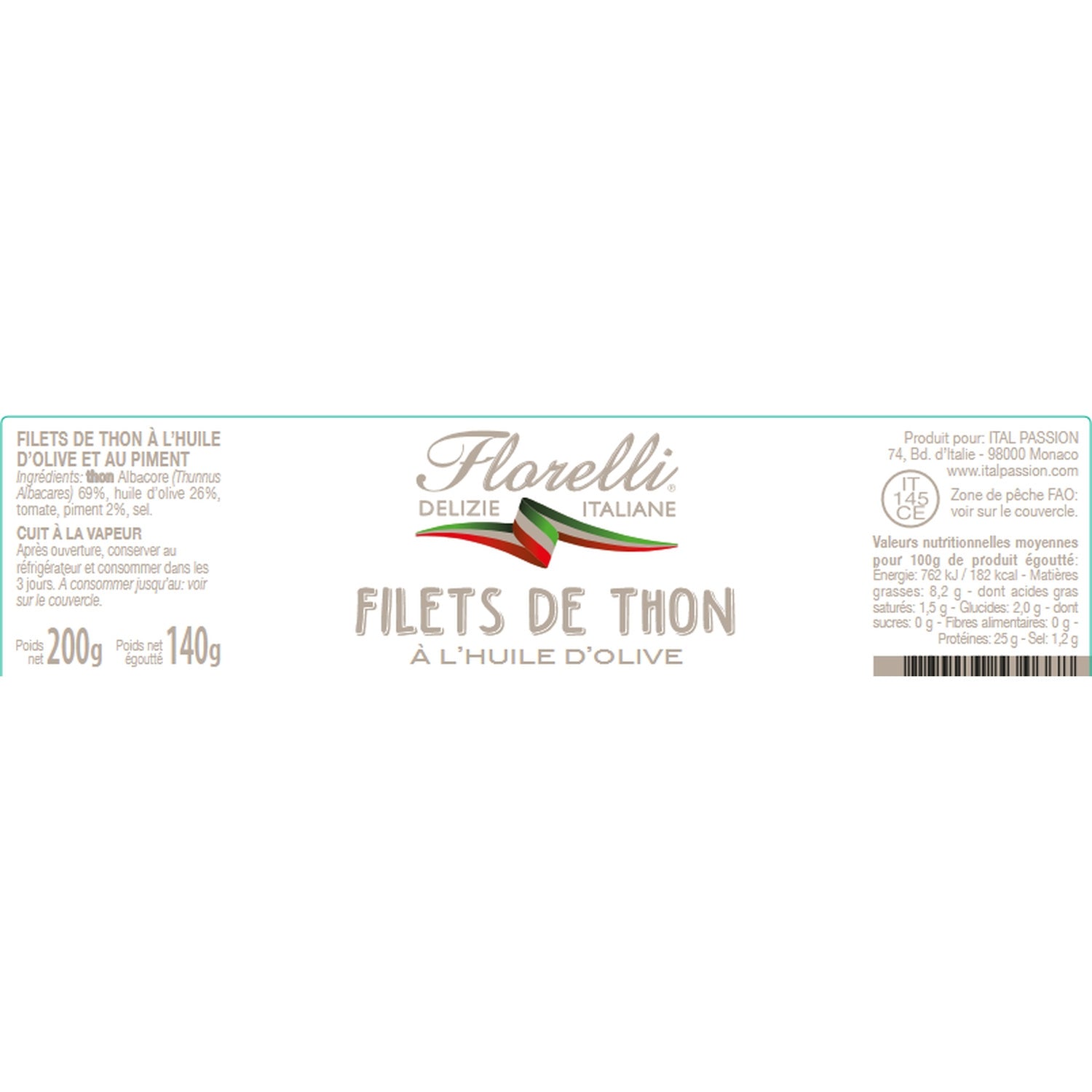 Ingrédients : filets de thon Albacore (thunnus albacares)(69%), huile d'olive (26%), tomate, piment (2%), sel.