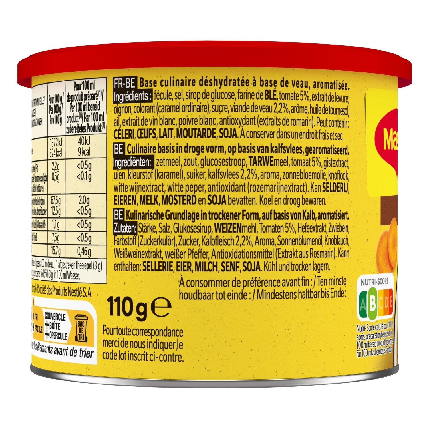 DétailsBase culinaire déshydratée à base de veau, aromatisée. Poids unitaire : 149 grs Code-barres EAN : 7613039830727 Marque : MAGGI