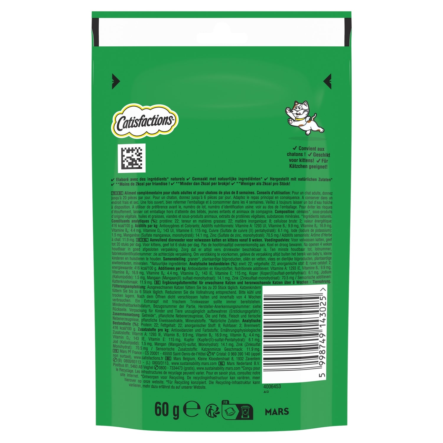 Les friandises pour chats Catisfactions ™ saveur d'herbe à chat sont disponibles en format sachet refermable de 60g pour une meilleure conservation.