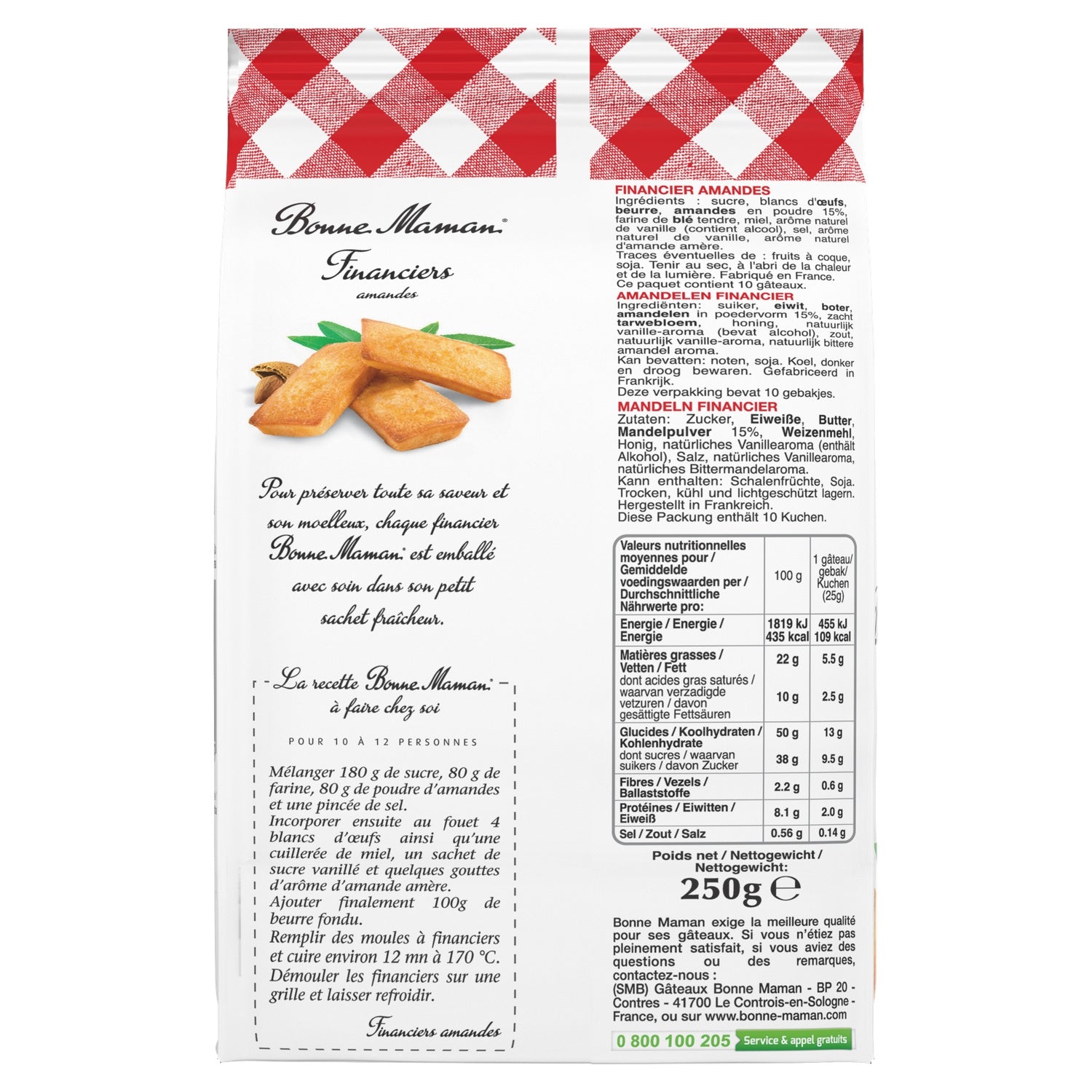 Grâce à son inimitable savoir-faire et à la qualité de ses ingrédients, Bonne Maman vous offre le meilleur, pour votre plus grand plaisir, tout simplement. L'authentique recette des financiers aux amandes, une recette pur beurre à la poudre d'amande pour une texture fondante. Pour préserver toute sa saveur et son moelleux, chaque financier Bonne Maman est emballé avec soin dans son petit sachet fraicheur.