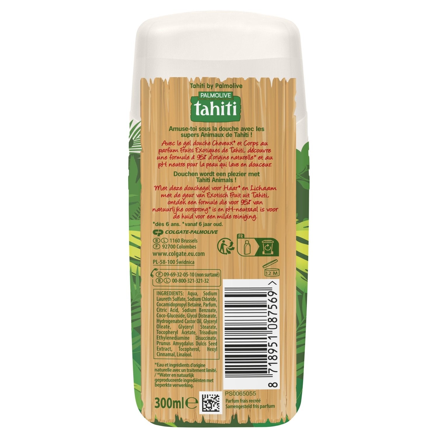 FORMULE RESPECTUEUSE DE LA PEAU : Avec son pH neutre, la formule de ce gel douche pour homme et femme respecte l'équilibre physiologique de la peau, pour nettoyer sans agresser.,AGENT HYDRATANT : Enrichi d'agent hydratant, le gel Tahiti douche laisse une sensation de peau douce, hydratée et agréablement parfumée.,MODE D'EMPLOI : Utilisez ce gel lavant pour votre toilette quotidienne, selon vos habitudes. En cas d'irritation, arrêtez l'utilisation. En cas de contact avec les yeux, rincez abondamment à l'eau claire.,ÉVEIL DES SENS: Libérons toute l'énergie authentique des parfums et ingrédients de Tahiti qui éveillent nos sens. Tahiti, vivons plus fort !,Une formule à 95% d'origine naturelle et au pH neutre pour la peau qui lave en douceur. Eau et ingrédients d'origine naturelle avec un traitement limité.