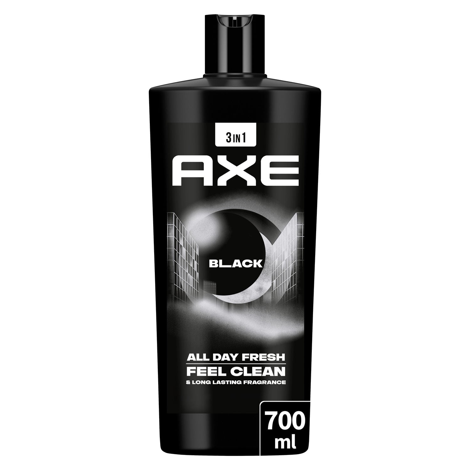 Sens-toi propre et frais, et sens irrésistiblement bon pour plus longtemps avec le nouveau gel douche homme 5-en-1 AXE Black au format 700 ml.,Grâce à notre incroyable formule qui élimine les bactéries responsables des mauvaises odeurs, ce gel douche au pH neutre offre fraîcheur et parfum toute la journée, tout en respectant la peau.,Testé dermatologiquement, ce gel douche contient 87 % d'ingrédients d'origine naturelle et t'assure 24 h d'hydratation. Il libère un parfum de baies noires et de bois de cèdre pour un effet addictif.,Verse le gel douche dans le creux de ta main. Fais-le mousser sur ton corps. Rince. Tu es propre et sens irrésistiblement bon !,La bouteille de ce gel douche AXE est 100 % en plastique recyclé et entièrement recyclable. Dépose-moi dans le bac de tri !,La nouvelle formule de ce gel douche est certifiée Peta, ce qui signifie qu'aucun test n'est fait sur les animaux dans le monde entier.