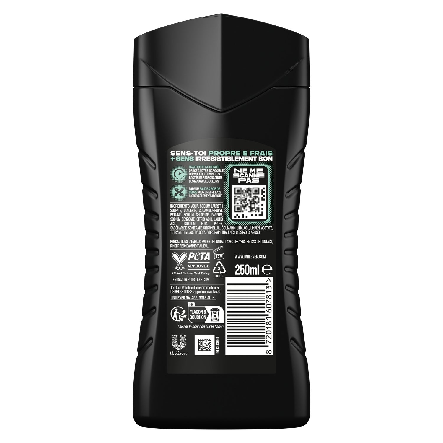 Bienvenue dans le futur, ça sent incroyablement bon ! Sens-toi propre et frais et sens irrésistiblement bon pour plus longtemps avec le nouveau gel douche homme 5-en-1 AXE Apollo au format 250 ml. Sa formule testée dermatologiquement et composée à 87 % d'ingrédients d'origine naturelle combat les odeurs et assure 24 h d'hydratation. Au pH neutre, elle élimine les bactéries responsables des mauvaises odeurs et offre fraîcheur et parfum toute la journée, tout en respectant la peau des hommes. Cette nouvelle formule est certifiée Peta, ce qui signifie qu'aucun test n'est fait sur les animaux dans le monde entier. Ce gel douche AXE libère un parfum de sauge et de bois de cèdre pour un effet incroyablement addictif. En plus, sa bouteille est 100 % en plastique recyclé et entièrement recyclable. Dépose-la dans le bac de tri ! Tu aimes le parfum de ce gel douche homme ? AXE Apollo existe aussi en déodorant pour encore plus de fraîcheur. Depuis 1983, la marque AXE, N°1 des déodorants en France*, accompagne les hommes au quotidien avec sa gamme complète de soins d'hygiène : déodorants, anti-transpirants, gels douche et eaux de toilette. Tout ce dont un homme a besoin pour affirmer son style et rester confiant tout au long de la journée. Car ce qui rend un homme attirant, c'est avant tout son propre style ! Nos produits ont une fragrance sensuelle aux notes sophistiquées, ce qui te permet de rester frais, confiant et de sentir bon, même lors des coups de chaud du quotidien. *CAM P9 2024 en ventes valeurs HMSM.