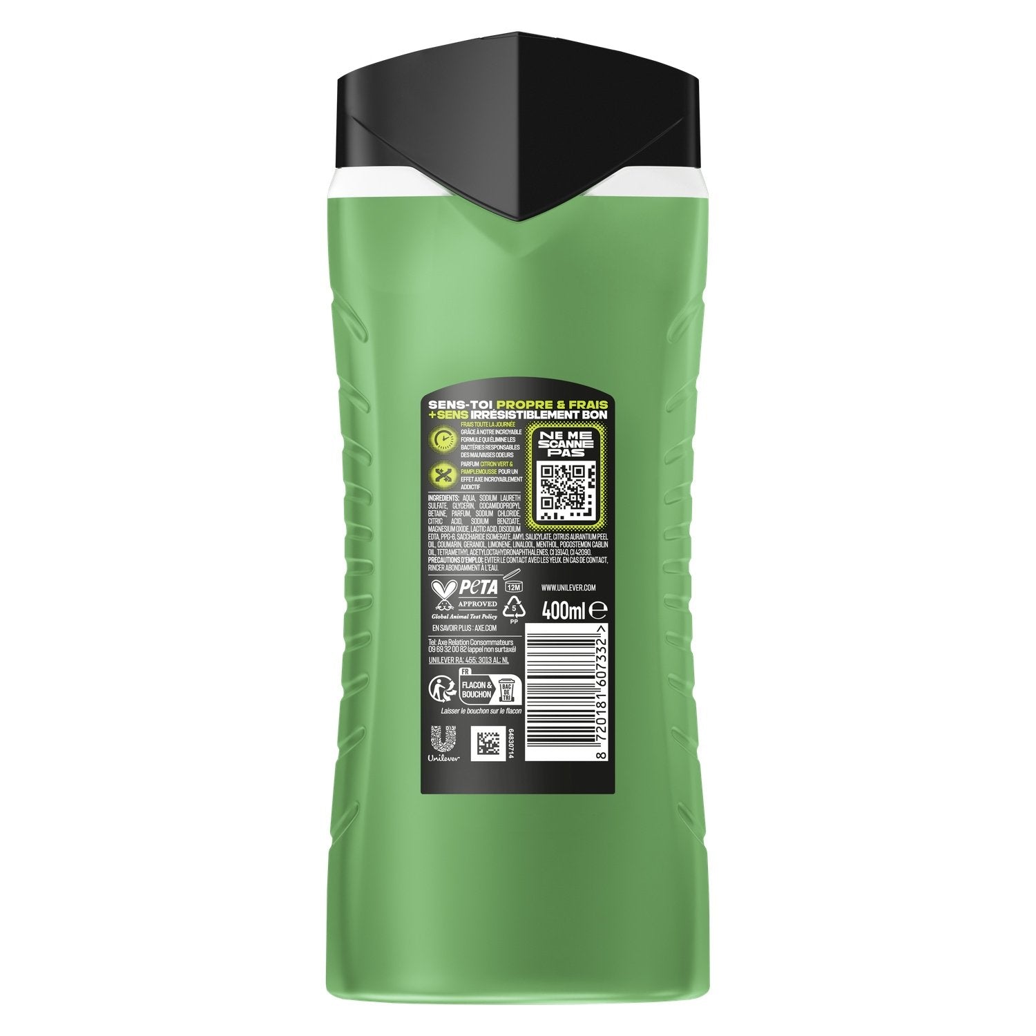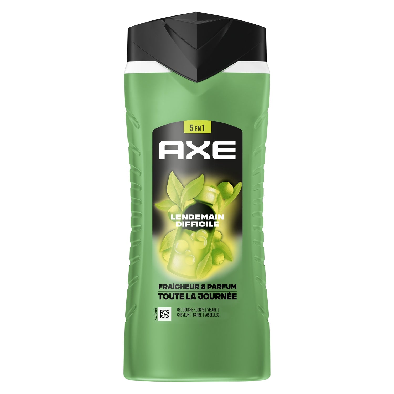 Sens-toi propre et frais, et sens irrésistiblement bon pour plus longtemps avec le nouveau gel douche homme 5-en-1 AXE Lendemain Difficile au format 400 ml.,Grâce à notre incroyable formule qui élimine les bactéries responsables des mauvaises odeurs, ce gel douche au pH neutre offre fraîcheur et parfum toute la journée, tout en respectant la peau.,Testé dermatologiquement, ce gel douche contient 87 % d'ingrédients d'origine naturelle et t'assure 24 h d'hydratation. Il libère un parfum frais d'agrumes pour un effet addictif.,Verse le gel douche dans le creux de ta main. Fais-le mousser sur ton corps. Rince. Tu es propre et sens irrésistiblement bon !,La bouteille de ce gel douche AXE est majoritairement recyclable. Dépose-moi dans le bac de tri !,La nouvelle formule de ce gel douche est certifiée Peta, ce qui signifie qu'aucun test n'est fait sur les animaux dans le monde entier.