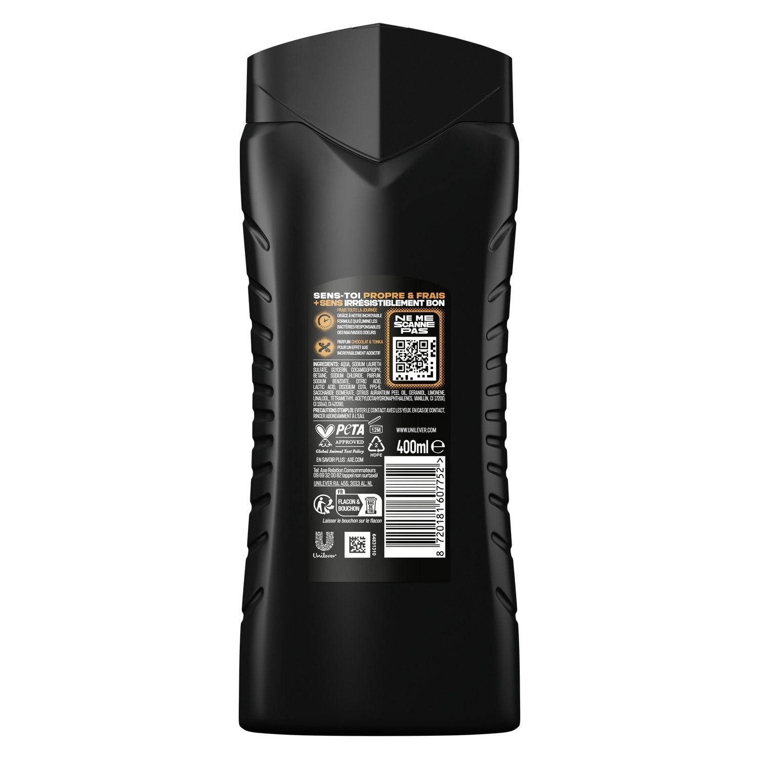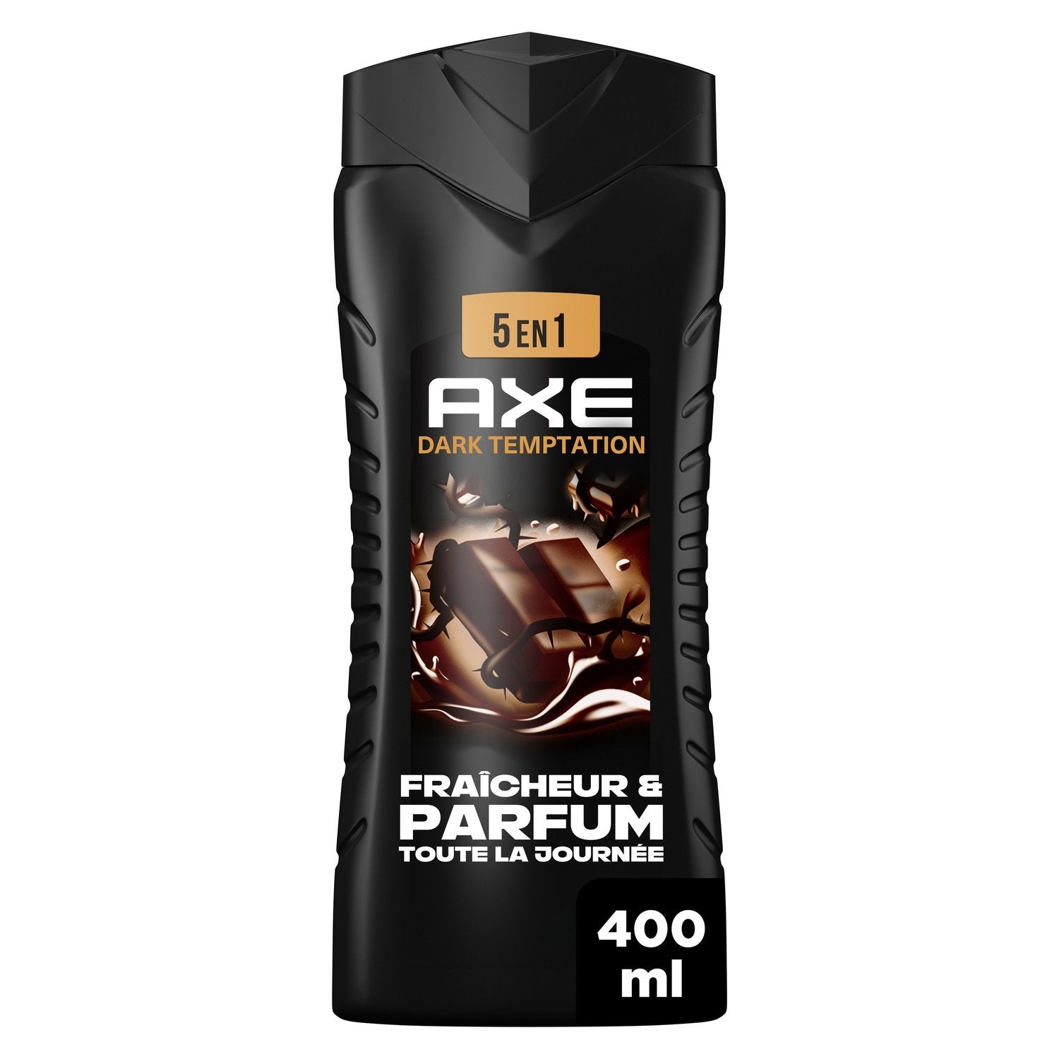 Sens-toi propre et frais, et sens irrésistiblement bon pour plus longtemps avec le nouveau gel douche homme 5-en-1 AXE Dark Temptation au format 400 ml.,Grâce à notre incroyable formule qui élimine les bactéries responsables des mauvaises odeurs, ce gel douche au pH neutre offre fraîcheur et parfum toute la journée, tout en respectant la peau.,Testé dermatologiquement, ce gel douche contient 87 % d'ingrédients d'origine naturelle et t'assure 24 h d'hydratation. Il libère un parfum de chocolat et de tonka pour un effet addictif.,Verse le gel douche dans le creux de ta main. Fais-le mousser sur ton corps. Rince. Tu es propre et sens irrésistiblement bon !,La bouteille de ce gel douche AXE est 100 % en plastique recyclé et entièrement recyclable. Dépose-moi dans le bac de tri !,La nouvelle formule de ce gel douche est certifiée Peta, ce qui signifie qu'aucun test n'est fait sur les animaux dans le monde entier.