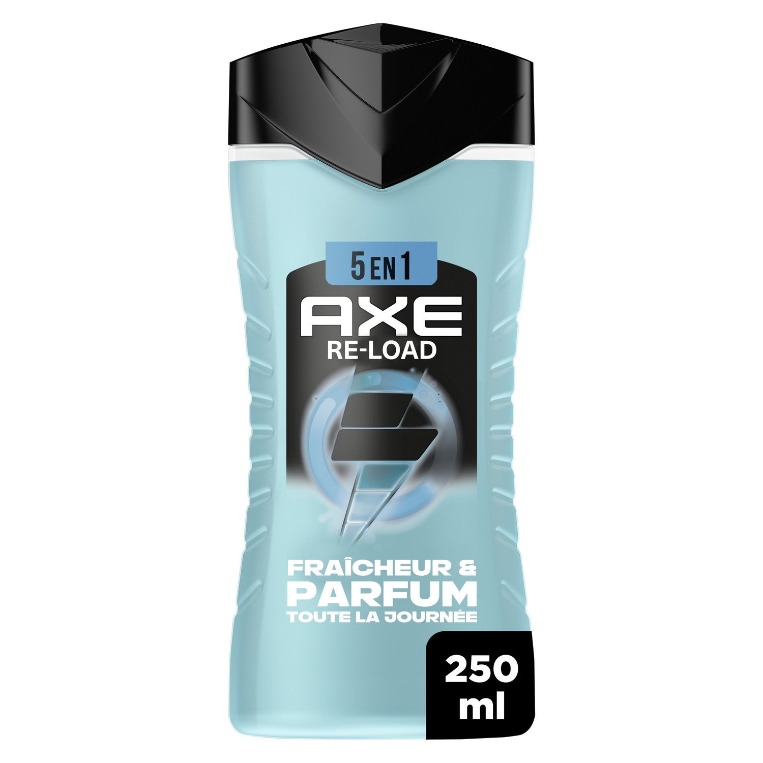 Sens-toi propre et frais, et sens irrésistiblement bon pour plus longtemps avec le nouveau gel douche homme 5-en-1 AXE Re-Load au format 250 ml.,Grâce à notre incroyable formule qui élimine les bactéries responsables des mauvaises odeurs, ce gel douche au pH neutre offre fraîcheur et parfum toute la journée, tout en respectant la peau.,Testé dermatologiquement, ce gel douche contient 87 % d'ingrédients d'origine naturelle et t'assure 24 h d'hydratation. Il libère un parfum frais et vivifiant pour un effet addictif.,Verse le gel douche dans le creux de ta main. Fais-le mousser sur ton corps. Rince. Tu es propre et sens irrésistiblement bon !,La bouteille de ce gel douche AXE est majoritairement recyclable. Dépose-moi dans le bac de tri !,La nouvelle formule de ce gel douche est certifiée Peta, ce qui signifie qu'aucun test n'est fait sur les animaux dans le monde entier.