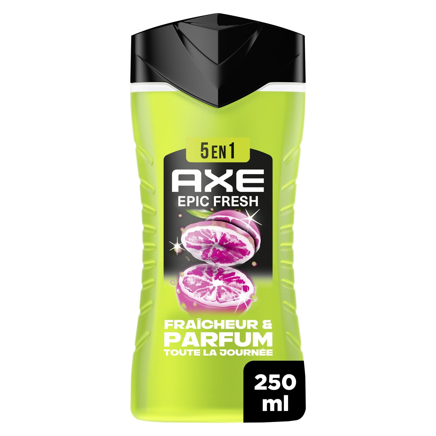 Sens-toi propre et frais, et sens irrésistiblement bon pour plus longtemps avec le nouveau gel douche homme 5-en-1 AXE Epic Fresh au format 250 ml.,Grâce à notre incroyable formule qui élimine les bactéries responsables des mauvaises odeurs, ce gel douche au pH neutre offre fraîcheur et parfum toute la journée, tout en respectant la peau.,Testé dermatologiquement, ce gel douche contient 87% d'ingrédients d'origine naturelle et t'assure 24 h d'hydratation. Il libère un parfum d'ananas tropical et de pamplemousse pour un effet addictif.,Verse le gel douche dans le creux de ta main. Fais-le mousser sur ton corps. Rince. Tu es propre et sens irrésistiblement bon !,La bouteille de ce gel douche AXE est majoritairement recyclable. Dépose-moi dans le bac de tri !,La nouvelle formule de ce gel douche est certifiée Peta, ce qui signifie qu'aucun test n'est fait sur les animaux dans le monde entier.