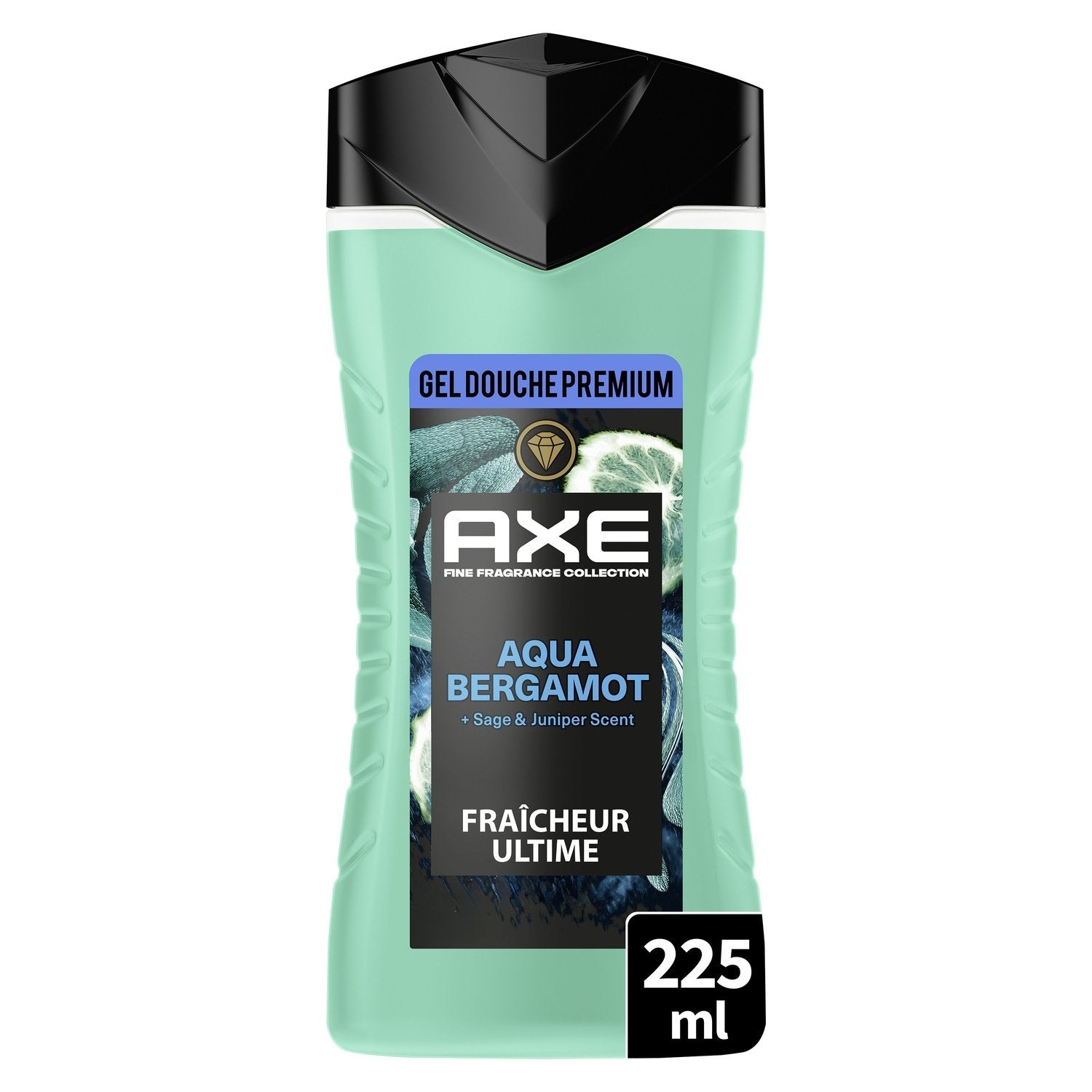 Découvre le gel douche homme AXE Aqua Bergamot au format 225 ml pour 12 h de fraîcheur.,Issu de notre collection Parfum Prestige, ce gel douche infusé aux huiles essentielles de bergamote, de sauge et de genévrier, est élaboré par des maîtres parfumeurs reconnus dans le monde entier.,La formule de ce gel douche contient des agents hydratants 100 % d'origine végétale.,Verse le gel douche dans le creux de ta main. Fais-le mousser sur ton corps. Rince. Tu es propre et sens irrésistiblement bon !,La bouteille de ce gel douche AXE est majoritairement recyclable. Dépose-moi dans le bac de tri !,Tu aimes le parfum de ce gel douche ? AXE Aqua Bergamote existe aussi en déodorant pour encore plus de fraîcheur.