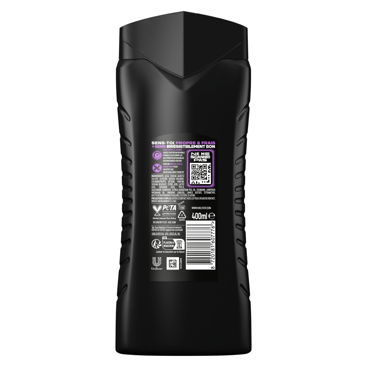 Sens-toi propre et frais, et sens irrésistiblement bon pour plus longtemps avec le nouveau gel douche homme 5-en-1 AXE Provocation au format 400 ml.,Grâce à notre incroyable formule qui élimine les bactéries responsables des mauvaises odeurs, ce gel douche au pH neutre offre fraîcheur et parfum toute la journée, tout en respectant la peau.,Testé dermatologiquement, ce gel douche contient 87 % d'ingrédients d'origine naturelle et t'assure 24 h d'hydratation. Il libère un parfum de noix de coco et de poivre noir pour un effet addictif.,Verse le gel douche dans le creux de ta main. Fais-le mousser sur ton corps. Rince. Tu es propre et sens irrésistiblement bon !,La bouteille de ce gel douche AXE est 100 % en plastique recyclé et entièrement recyclable. Dépose-moi dans le bac de tri !,La nouvelle formule de ce gel douche est certifiée Peta, ce qui signifie qu'aucun test n'est fait sur les animaux dans le monde entier.