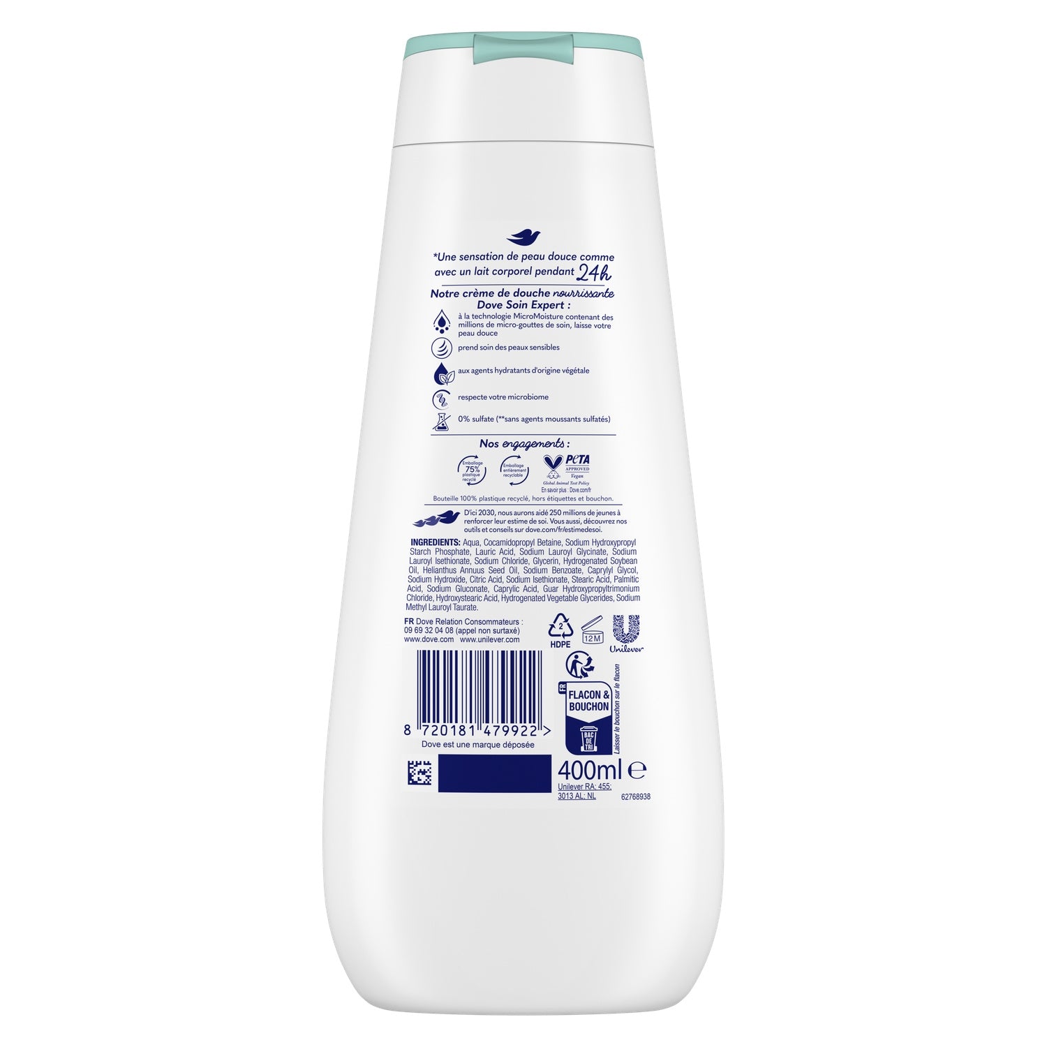 Élue produit de l'année 2025 par les consommateurs en France, la crème de douche Dove Advanced Care Hypoallergénique 400 ml prend soin des peaux sensibles et procure une sensation de peau douce comme avec un lait corporel pendant 24 h. Testée dermatologiquement, la formule de cette crème de douche contient des actifs hydratants et nourrissants d'origine végétale. Respectueux du microbiome et doté de la technologie MicroMoisture contenant des millions de micro-gouttes de soin, ce gel douche femme Dove laisse votre peau douce. Sa texture crémeuse se transforme sur la peau en une mousse très onctueuse pour un véritable moment de bien-être sous la douche. Dove Advanced Care est notre gamme de gels douche la plus experte en soin et convient à l'hygiène quotidienne. L'emballage de ce gel douche est entièrement recyclable. Dove offre aux femmes de véritables rituels beauté pour qu'elles prennent soin d'elles au quotidien. En mettant son expertise technologique au service de la beauté, la marque propose des soins hautement performants pour le corps. Ses maîtres-mots qualité, simplicité et efficacité se retrouvent dans chacun de ses produits uniques. À travers son Projet pour l'Estime de Soi, Dove œuvre depuis plus de 15 ans pour renforcer la confiance corporelle des jeunes filles à travers le monde. D'ici à 2030, nous aurons aidé 250 millions de jeunes à renforcer leur estime de soi. Parce que la beauté n'a ni formes, ni tailles, ni couleurs, la marque s'engage à réaliser ses supports de communication avec de vraies femmes et non des mannequins professionnels. Dove écrit sa version de la beauté à vos côtés : positive, authentique et réelle.