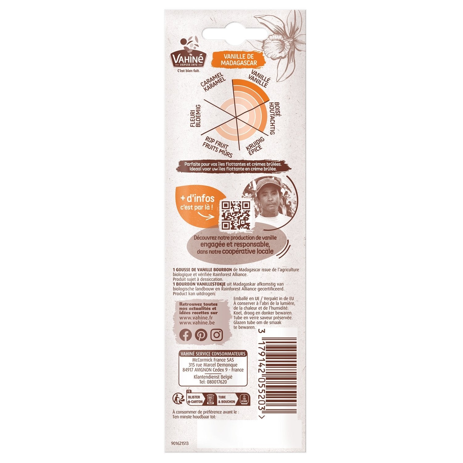 1 gousse de Vanille Bourbon de Madagascar issue de l'agriculture biologique et vérifiée Rainforest Alliance. Produit sujet à dessiccation.