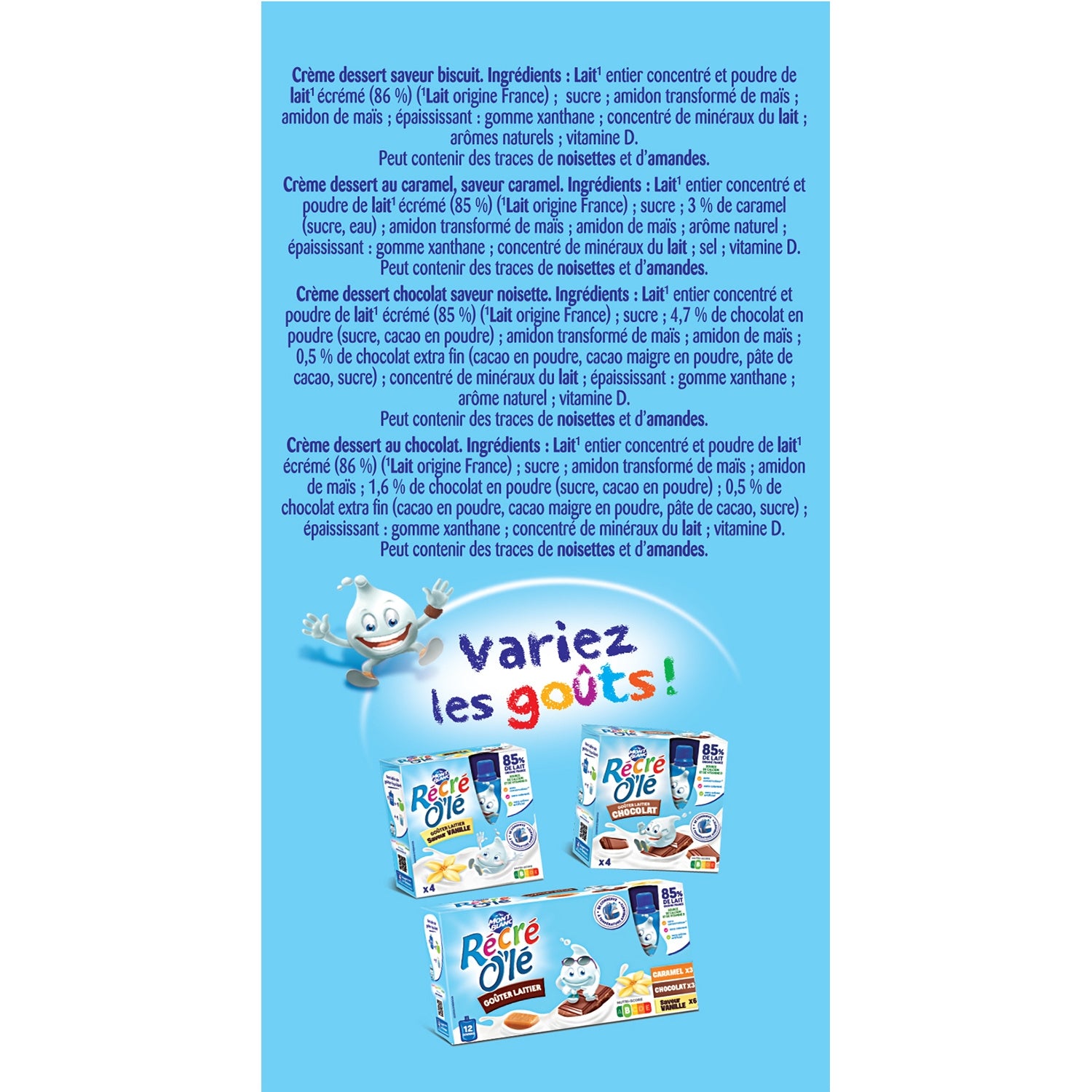 Crème dessert saveur biscuit. Crème dessert au caramel, saveur caramel. Crème dessert chocolat saveur noisette. Crème dessert au chocolat.