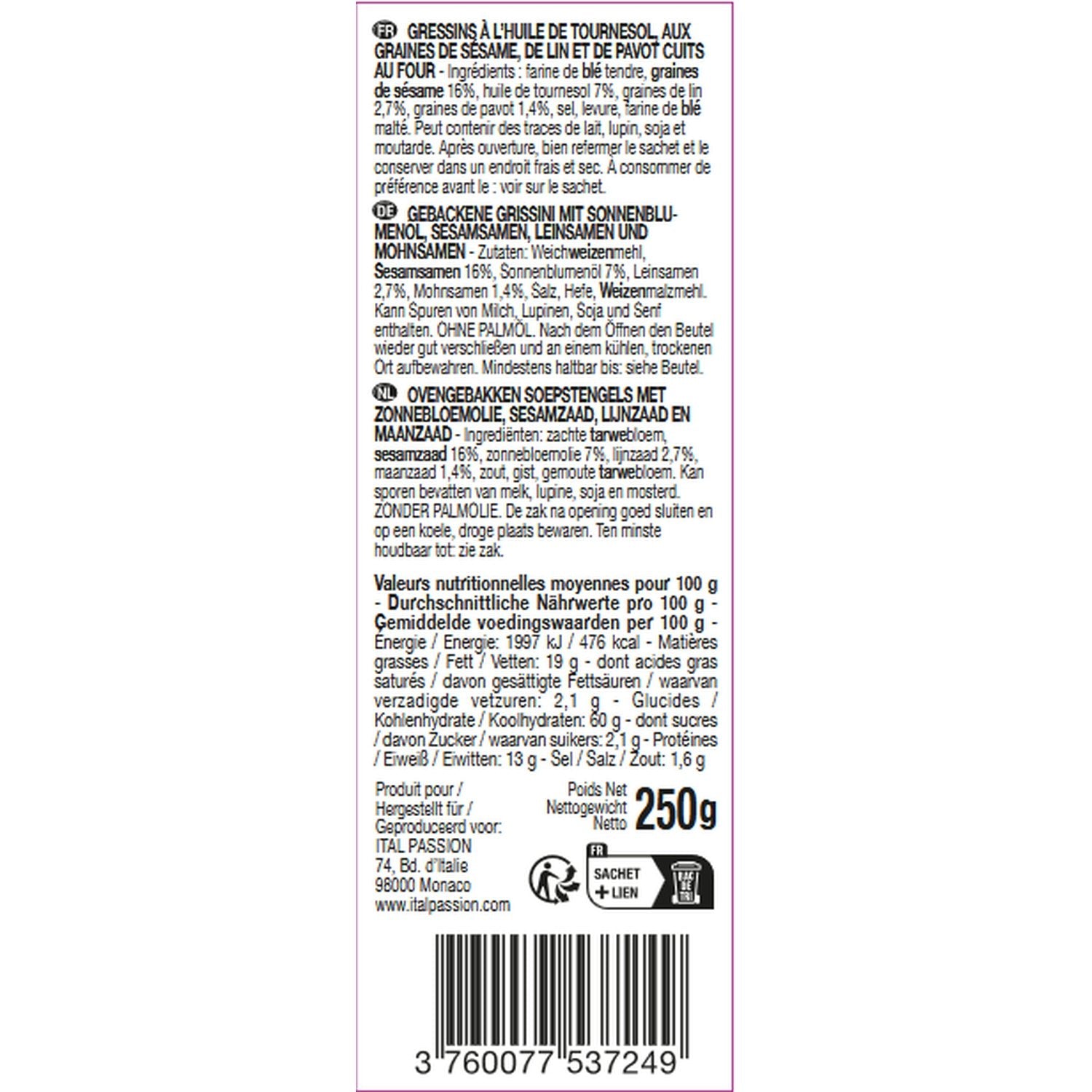 Ingrédients : Farine DE BLÉ tendre type « 0 », mélange de graines en proportion variable (SESAME, lin, pavot) 20%, huile de tournesol, sel, levure (Saccharomyces Cerevisiae), farine de froment malté. Contient DU GLUTEN et du SESAME.