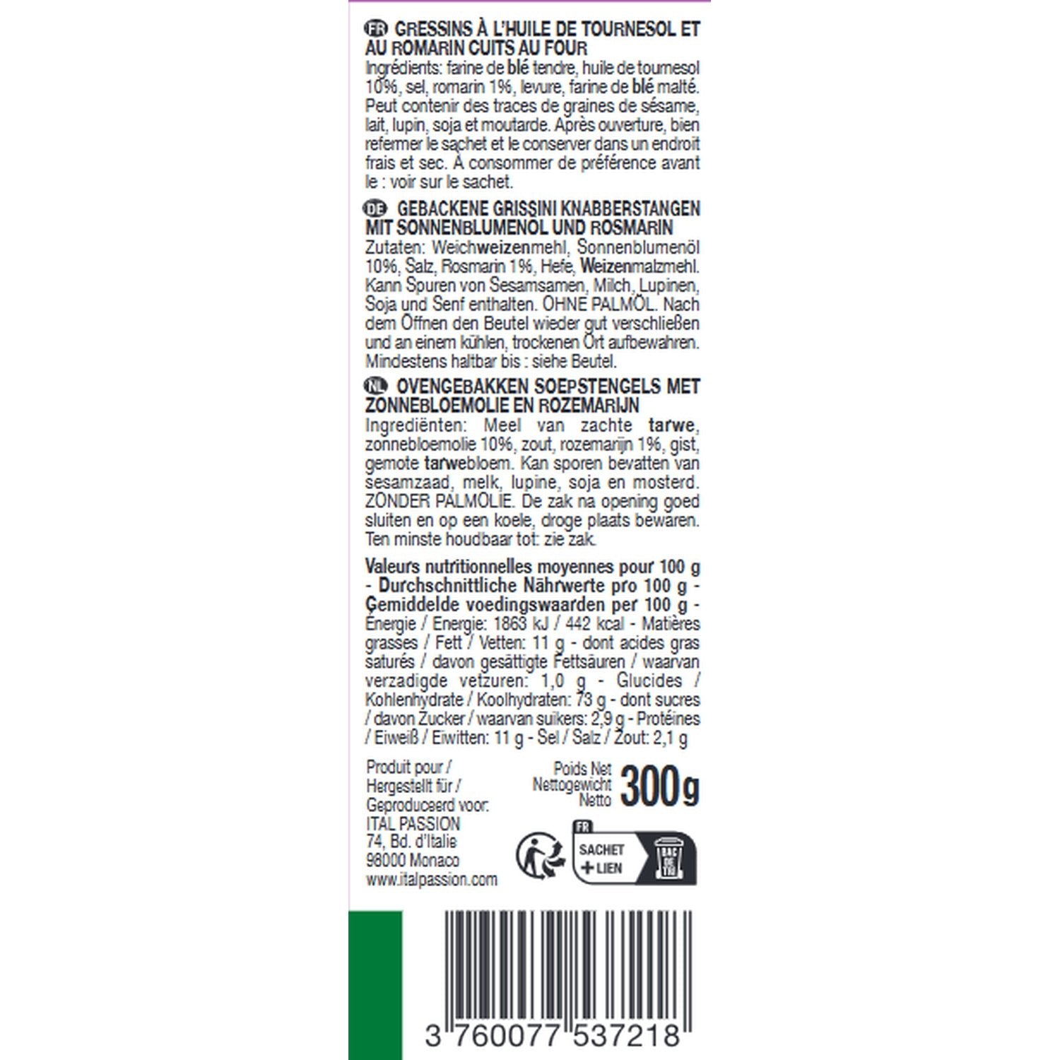 Ingrédients : Farine de BLÉ tendre type « 0 », huile de tournesol, sel, romarin 1%, levure (Saccharomyces Cerevisiae), farine de froment malté. Contient du GLUTEN. Peut contenir des traces de SESAME.