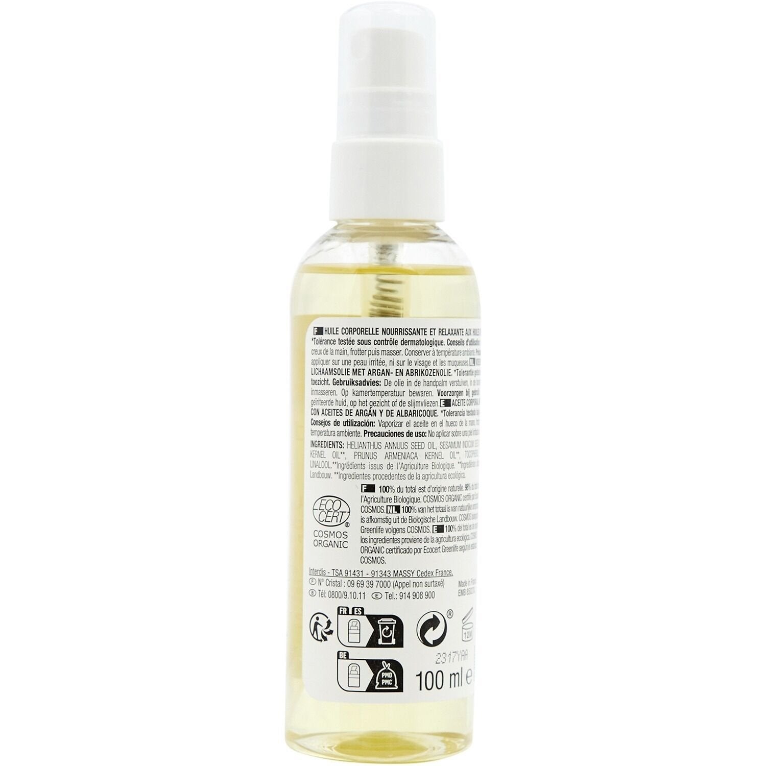 Helianthus annuus seed oil, sesamum indicum seed oil*, argania spinosa kernel oil*, prunus armeniaca kernel oil*, tocopherol, parfum, limonene, linalool. *Ingrédients issus de l'agriculture biologique. 100% du total est d'origine naturelle. 98% du total des ingrédients sont issus de l'agriculture biologique.