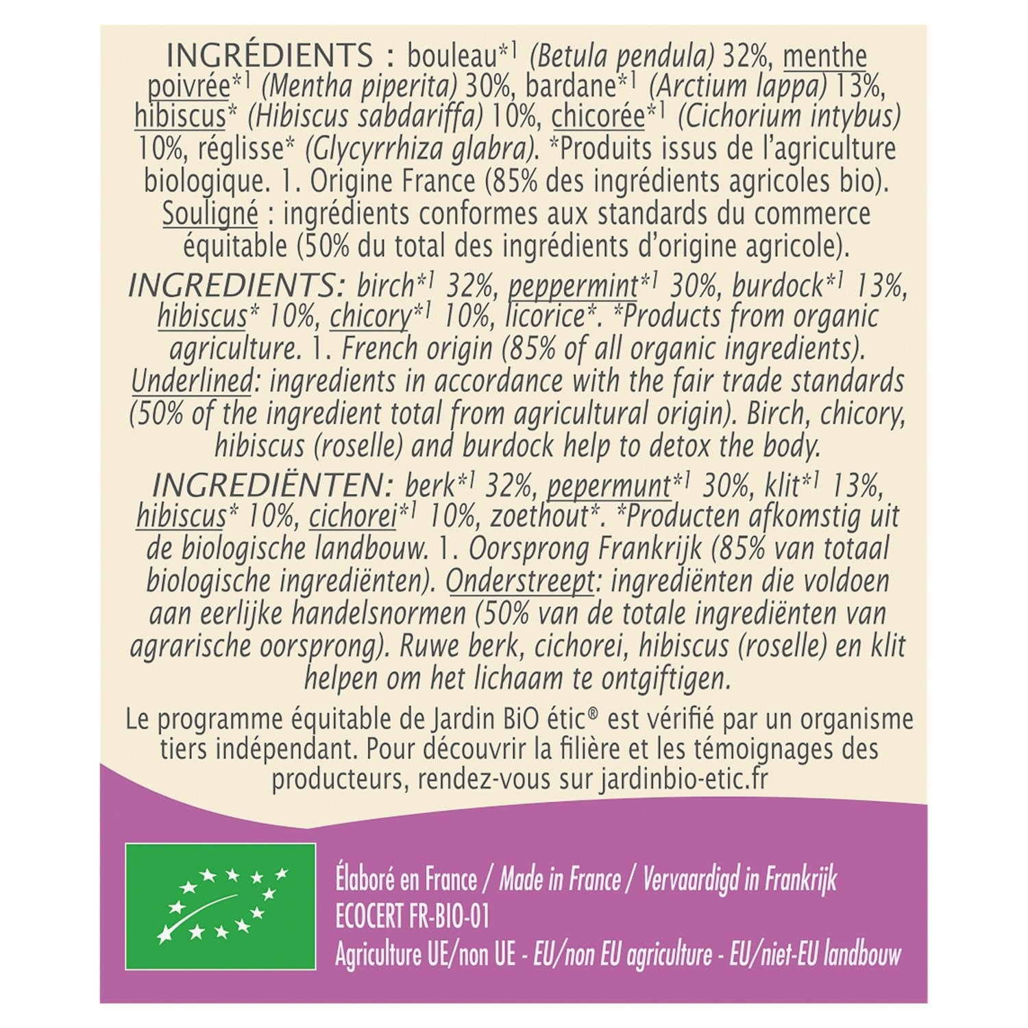 INGRÉDIENTS : bouleau*1 (Betula pendula) 32%, menthe poivrée*1 (Mentha piperita) 30%, bardane*1 (Arctium lappa) 13%, hibiscus* (Hibiscus sabdariffa) 10%, chicorée*1 (Cichorium intybus) 10%, réglisse* (Glycyrrhiza glabra). *Produits issus de l'agriculture biologique. 1. Origine France (85% des ingrédients agricoles bio). 50% du total des ingrédients d'origine agricole sont conformes aux standards du commerce équitable (menthe poivrée, hibiscus, chicorée).
