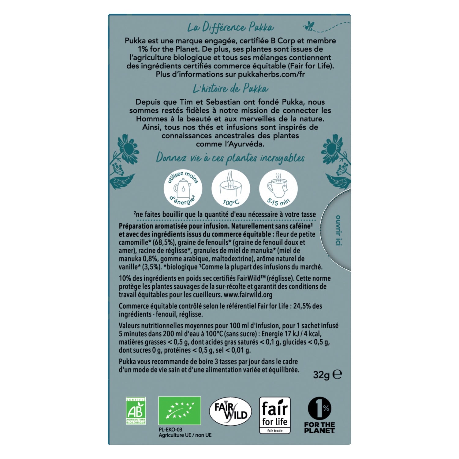 Préparation aromatisée pour infusion. Naturellement sans caféine1 et avec des ingrédients issus du commerce équitable : fleur de petite camomille* (68,5%), graine de fenouil*, racine de réglisse*, granules de miel de manuka* (gomme arabique, maltodextrine, miel de manuka 0,8%), extrait de vanille* (3,5%). *biologique 1Comme la plupart des infusions du marché. 10% des ingrédients en poids sec certifiés FairWildTM (réglisse). Cette norme protège les plantes sauvages de la sur-récolte et garantit des conditions de travail équitables pour les cueilleurs. www.fairwild.org. Commerce équitable contrôlé selon le référentiel Fair for Life : 24,5% des ingrédients - fenouil, réglisse.
