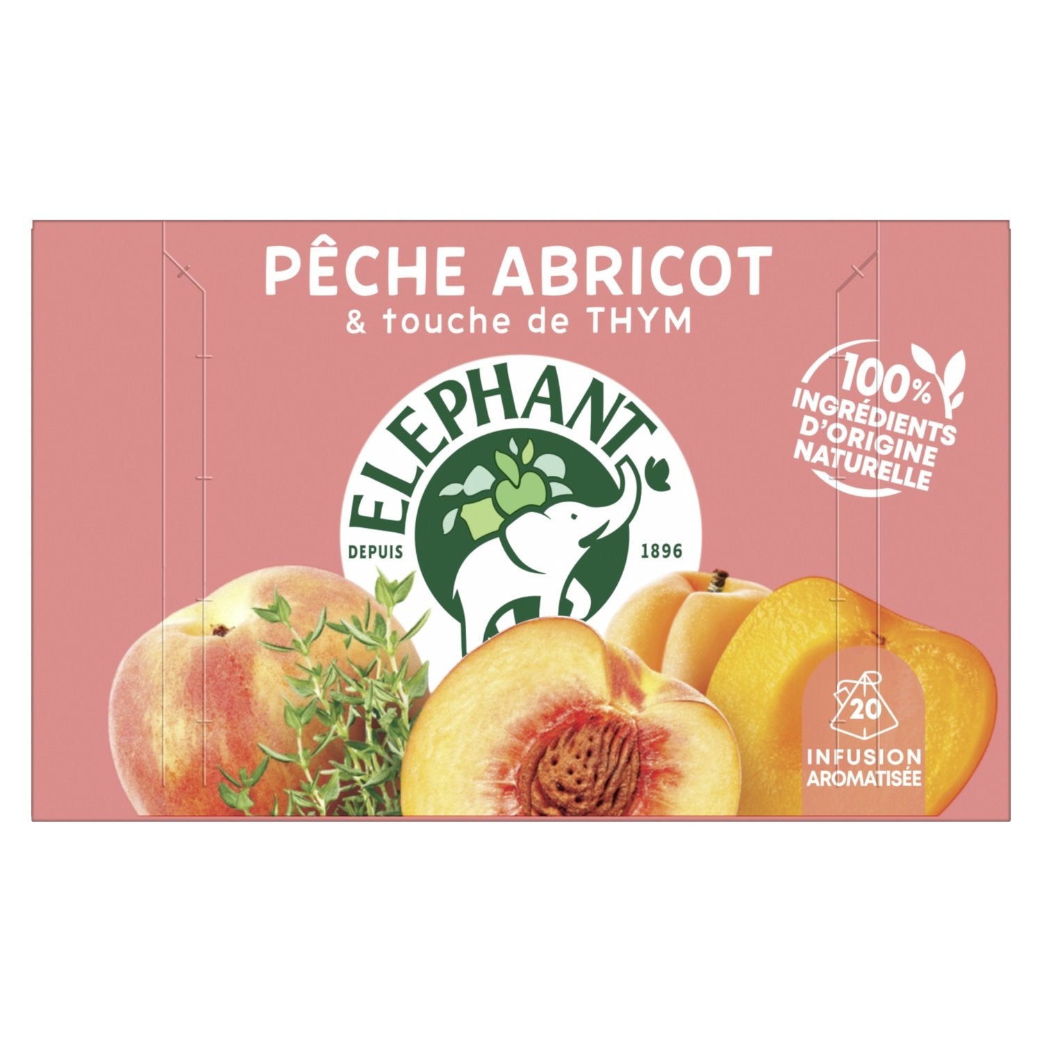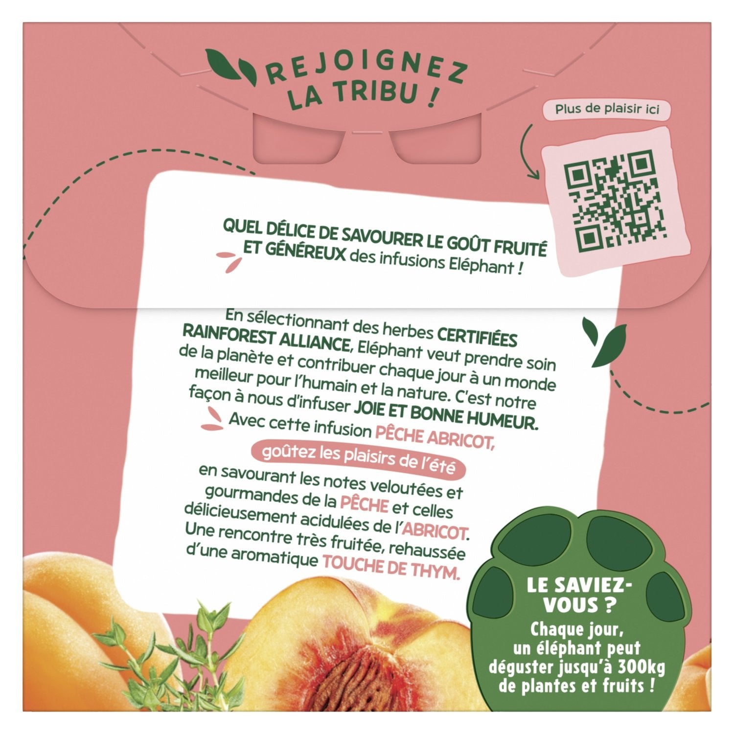 Goûtez les plaisirs de l'été en savourant les notes veloutées et gourmandes de la pêche et celles délicieusement acidulées de l'abricot grâce à l'infusion Pêche Abricot et ses 20 Sachets Pyramid®. Une rencontre très fruitée, rehaussée d'une aromatique touche de thym. En sélectionnant des herbes certifiées Rainforest Alliance, Eléphant veut prendre soin de la planète et contribuer chaque jour à un monde meilleur pour l'humain et la nature. C'est notre façon à nous d'infuser joie et bonne humeur. Le secret de notre infusion ? 100% de ses ingrédients sont d'origine naturelle. Rien que pour vous, Eléphant a soigneusement sélectionné des plantes et fruits pour vous proposer cette gamme Fruitée au goût généreux. Pour une dégustation idéale, laissez infuser votre sachet d'infusion Pyramid® 4-5 minutes dans 200 ml d'eau chaude et dégustez. L'aventure Eléphant commence en 1896 et se poursuit encore aujourd'hui. Ce qui, de mémoire d'éléphant, fait une sacrée expérience pour un créateur d'infusions... Son plus grand plaisir, depuis toujours, est d'agiter nos papilles ! Eléphant fait de l'écoute de la nature une vraie force, qu'il utilise pour choisir le meilleur des plantes et des fruits et concocter de délicieuses infusions uniques et appréciées de tous. Mais ne vous y trompez pas, Eléphant*, marque préférée des Français, dans sa grande générosité, y ajoute aussi bienveillance, simplicité, une pointe d'humour et un brin d'originalité. Alors, rejoignez la tribu et découvrez toutes les autres délicieuses recettes de notre gamme Fruitée. *Eléphant, leader valeur & volume en France — Nielsen année 2022