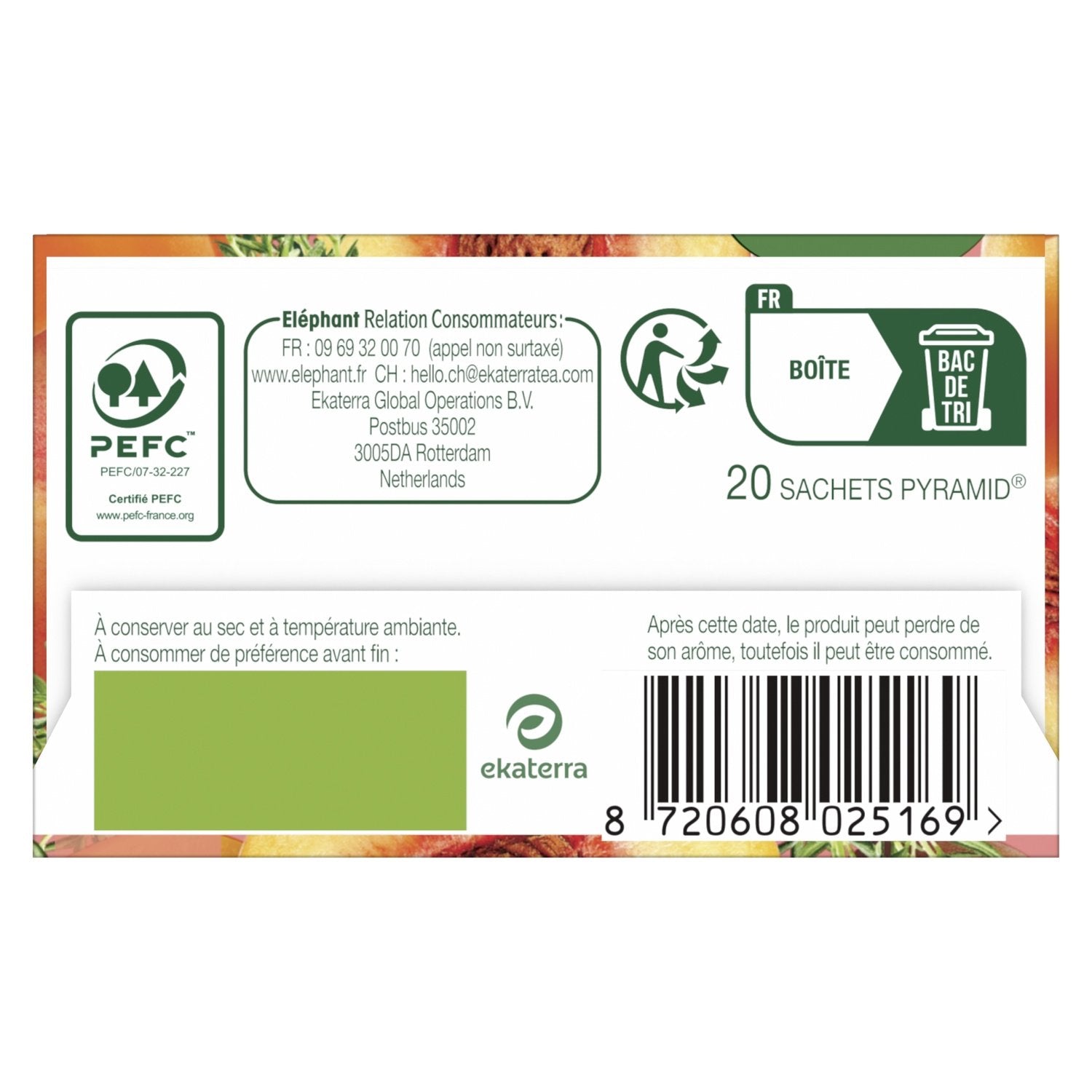 Ingrédients: églantier¹, écorce d'orange¹, pomme¹, hibiscus¹, feuille d'oranger¹, arôme naturel, maltodextrine, pêche 2%, abricot 2%, thym 1,5%, feuille de stevia. ¹Certifié Rainforest Alliance
