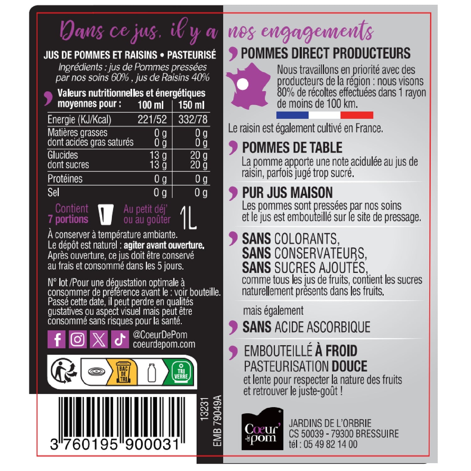 Le goût des fruits qu'on croque ! Équilibre délicieux de 2 fruits complémentaires, la pomme venant atténuer les notes parfois trop sucrées des purs jus de raisin. Fruits pressés dans nos ateliers 100% français.
