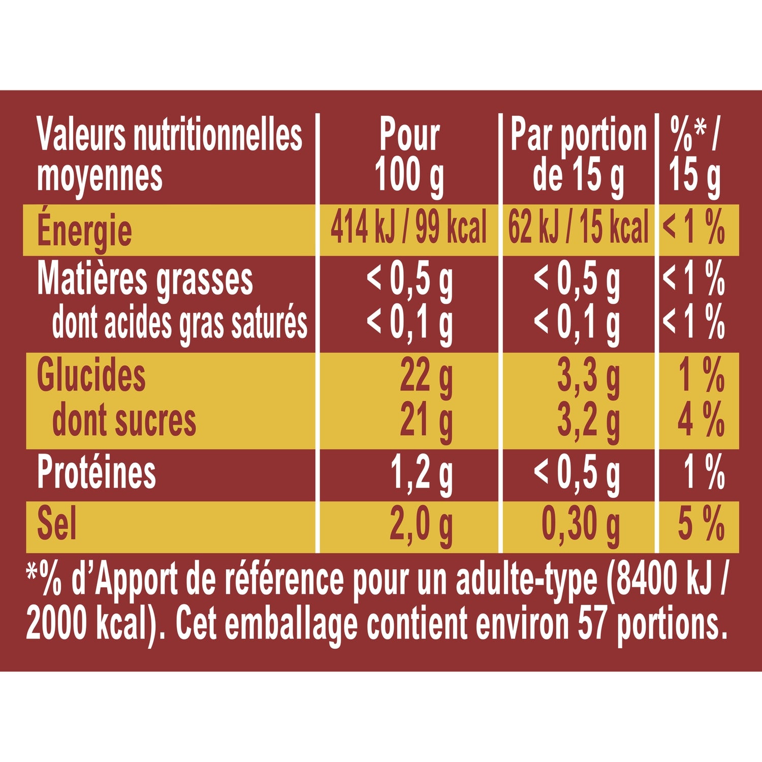 Ingrédients : tomates¹ (151 g de tomates pour 100 g de ketchup), sucre, vinaigre d'alcool, sel, arômes naturels, épices. ¹Tomates issues de l'agriculture durable.