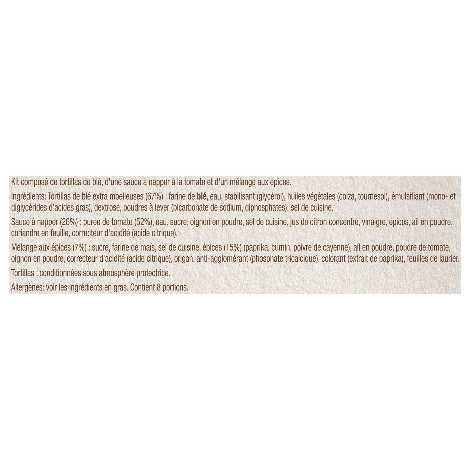 Tortillas de BLE extra moelleuses (67%) : farine de BLE, eau, stabilisant (glycérol), huiles végétales (colza, tournesol), émulsifiant (mono- et diglycérides d'acides gras), dextrose, poudres à lever (bicarbonate de sodium, diphosphates), sel de cuisine. Sauce à napper (26%) : purée de tomate (52%), eau, sucre, oignon en poudre, sel de cuisine, jus de citron concentré, vinaigre, épices, ail en poudre, coriandre en feuille, correcteur d'acidité (acide citrique). Mélange aux épices (7%) : sucre, farine de maïs, sel de cuisine, épices (15%) (paprika, cumin, poivre de cayenne), ail en poudre, poudre de tomate, oignon en poudre, correcteur d'acidité (acide citrique), origan, anti-agglomérant (phosphate tricalcique), colorant (extrait de paprika), feuilles de laurier.Allergènes : voir les ingrédients en MAJUSCULES. Suite aux difficultés d'approvisionnement sur certaines matières premières liées à la guerre en Ukraine, des changements ont été apportés dans la recette du produit. L'information donnée sur le produit peut être en décalage avec la recette. Une dérogation d'étiquetage a été accordée par la DGCCRF. Vous trouverez le détail des modifications opérées sur : https://www.economie.gouv.fr/dgccrf/rechercher-produit-recette-temporairement-modifiee