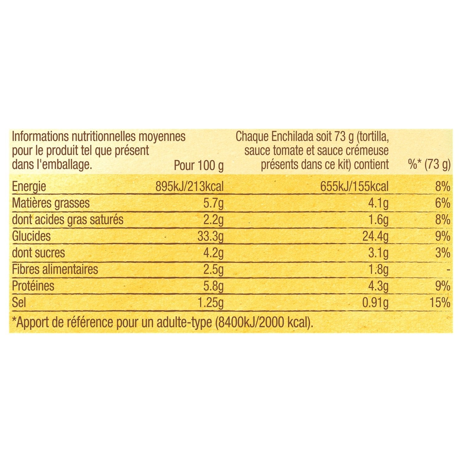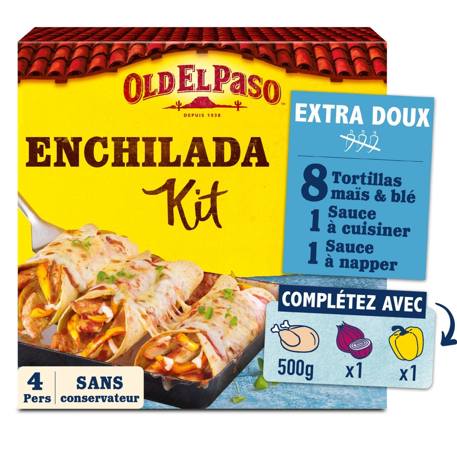 Découvrez le Kit Enchiladas extra doux Old El Paso™, idéal pour 8 personnes, prêt en 25 minutes et sans conservateur. Le kit est composé de 8 tortillas de maïs et blé (galettes), d'un sachet de sauce à cuisiner et d'un mélange aux épices. Réalisez vos enchiladas en complétant avec 500g de poulet, un oignon, un poivron jaune ainsi que de 100g de mozzarella ! Idées recettes : rendez-vous sur notre site internet oldelpaso.fr. Accompagnez vos repas inspirés de la cuisine mexicaine avec des Tortilla Nachips Old El Paso™ et laissez-vous tenter par le Guacamole Old El Paso™, idéal pour l'apéritif ! Astuce : remplacez la viande par votre équivalent végétarien préféré ! Et n'oubliez pas, Vendredi c'est Fajitas Party !