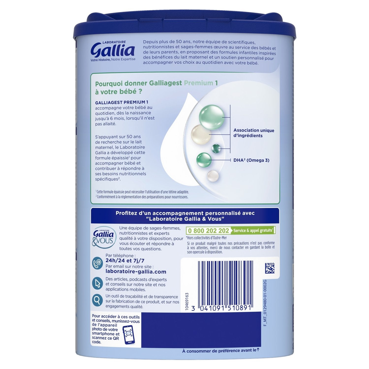 GALLIAGEST PREMIUM 1 accompagne votre bébé au quotidien, dès la naissance jusqu'à 6 mois, lorsqu'il n'est pas allaité. S'appuyant sur 50 ans de recherche sur le lait maternel, le Laboratoire Gallia a développé cette formule épaissie (peut nécessiter l'utilisation d'une tétine adaptée.) pour accompagner bébé et contribuer à répondre à ses besoins nutritionnels spécifiques. (Conformément à la réglementation des préparations pour nourrissons.)