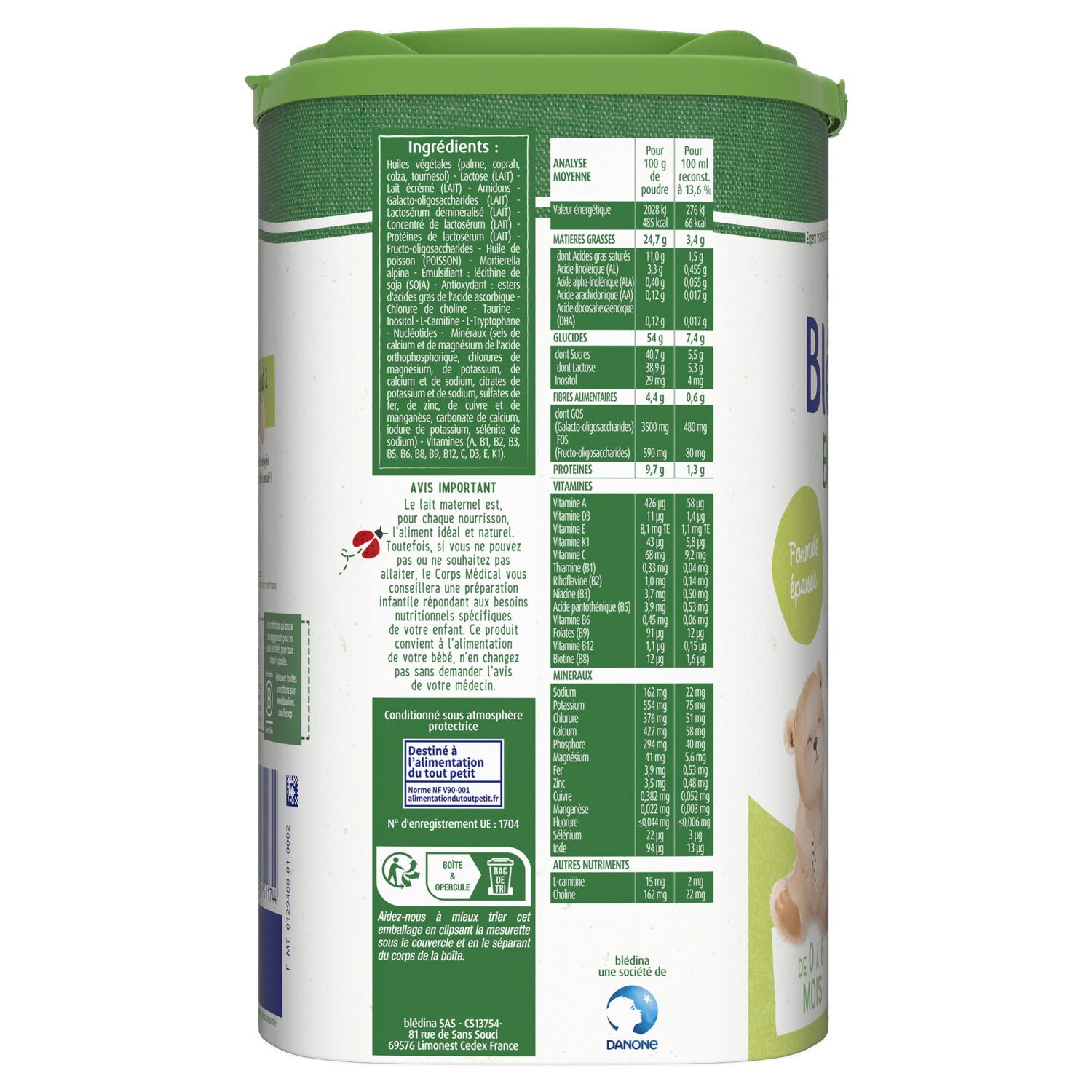 Ingrédients : Huiles végétales (palme, coprah, colza, tournesol) - Lactose (LAIT) - LAIT écrémé (LAIT) - Amidons - Galacto-oligosaccharides (LAIT) - Lactosérum déminéralisé (LAIT) - Concentré de lactosérum (LAIT) - Protéines de lactosérum (LAIT) - Fructo-oligosaccharides - Huile de POISSON (POISSON) - Mortierella alpina - Emulsifiant : lécithine de SOJA (SOJA) - Antioxydant : esters d'acides gras de l'acide ascorbique - Chlorure de choline - Taurine - Inositol - L-Carnitine - L-Tryptophane - Nucléotides - Minéraux (sels de calcium et de magnésium de l'acide orthophosphorique, chlorures de magnésium, de potassium, de calcium et de sodium, citrates de potassium et de sodium, sulfates de fer, de zinc, de cuivre et de manganèse, carbonate de calcium, iodure de potassium, sélénite de sodium) - Vitamines (A, B1, B2, B3, B5, B6, B8, B9, B12, C, D3, E, K1).