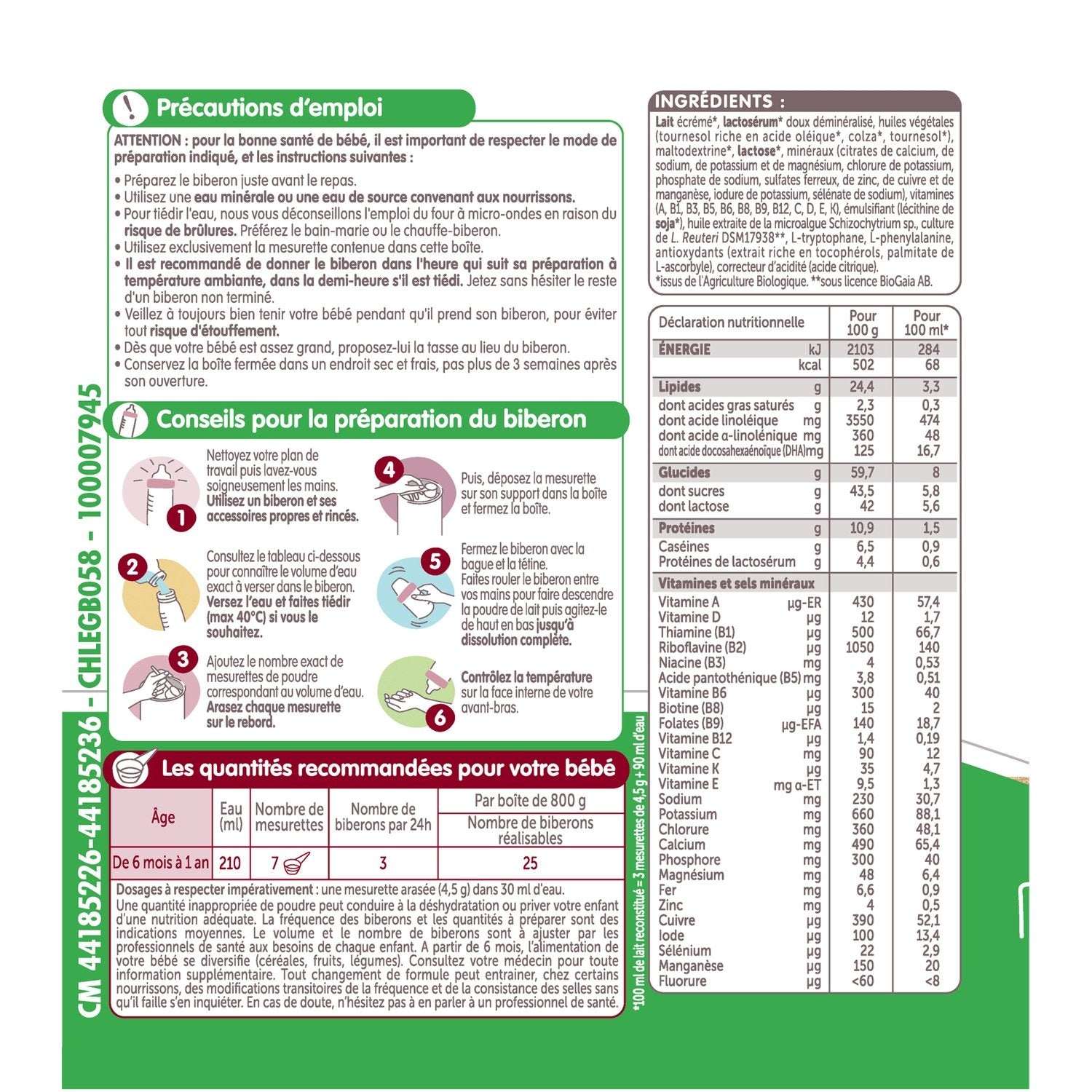 Ingrédients : LAIT écrémé* 76%, LACTOSÉRUM doux déminéralisé*, huiles végétales (tournesol oléique*, colza*, tournesol*), LACTOSE*, minéraux (citrates de calcium, de sodium, de potassium et de magnésium ; chlorure de potassium ; phosphate de sodium sulfates ferreux, de zinc, de cuivre et de manganèse ; iodure de potassium ; sélénate de sodium), émulsifiant (lécithine de SOJA*), huile extraite de la microalgue Schizochytrium sp., vitamines (A, B1, B3, B5, B6, B8, B9, B12, C, D, E, K), culture de L. Reuteri DSM17938** , L-tryptophane, L-phénylalanine, antioxydants (extrait riche en tocophérols, palmitate de L-ascorbyle), correcteur d'acidité (acide citrique). *issus de l'Agriculture Biologique. **sous licence BioGaia AB