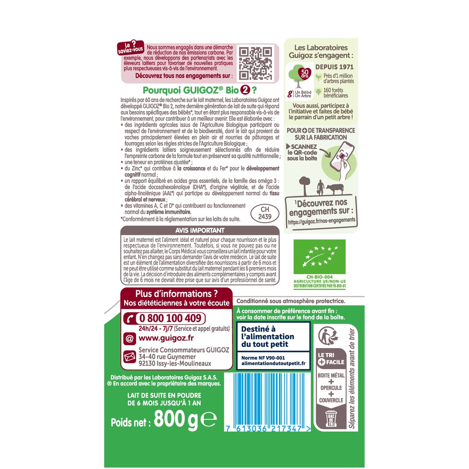 Pourquoi Guigoz® BIO 2 ? Inspirés par plus de 60 ans de recherche sur le lait maternel, les Laboratoires Guigoz ont développé GUIGOZ® Bio 2, qui répond aux besoins spécifiques des bébés*, tout en étant engagés dans une démarche plus responsable pour contribuer à un meilleur avenir. Elle est élaborée avec : Des ingrédients agricoles issus de l'Agriculture Biologique participant au respect de l'environnement et de la biodiversité**, dont le lait provient de vaches principalement élevées en plein air, sont nourries de pâturages et fourrages selon les règles strictes de l'Agriculture Biologique. Du lait BIO soigneusement sélectionné**, d'origine des Alpes Suisses. Du Zinc* qui contribue à la croissance et du Fer* pour le développement cognitif normal. Un rapport équilibré en acides gras essentiels, de la famille des oméga 3 : de l'acide docosahexaénoïque (DHA*), d'origine végétale, et de l'acide alpha-linolénique (AAL*) qui participe au développement normal du tissu cérébral et nerveux. Des vitamines A*, C* et D* qui contribuent au fonctionnement normal du système immunitaire.* Conformément à la réglementation sur les laits de suite.**Conformément à la réglementation sur l'Agriculture Biologique.