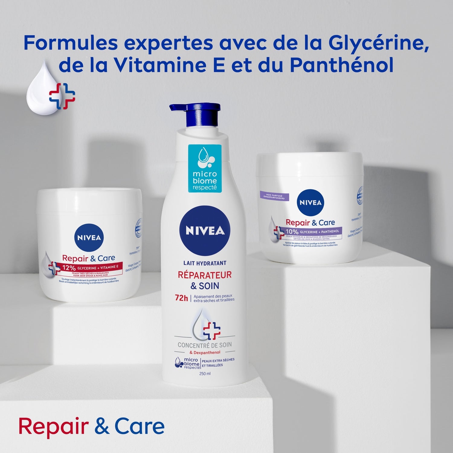 Le Lait Hydratant Réparateur et Soin est enrichi en Concentré de Soin NIVEA & Dexpanthenol pour une peau apaisée et hydratée pendant 72H. Dès la première application, sa formule renforce la barrière cutanée pour prévenir la perte d'hydratation et soulage la peau des tiraillements.