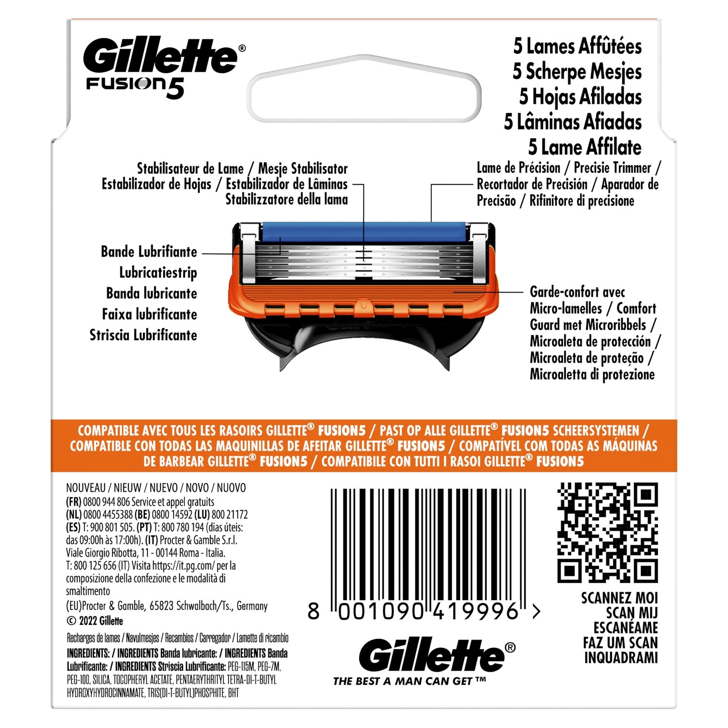 Bénéficiez d'un rasage de plus près et durable* avec les recharges de lames pour homme Gillette Fusion5. Avec cinq lames anti-friction pour un rasage de près, et une lame de précision pour les zones difficiles d'accès. La bande lubrifiante plus large fait mieux glisser les lames*. Vous craignez que votre manche Gillette ne soit pas compatible? Les lames Fusion5 sont compatibles avec tous les manches Gillette Fusion5. Chaque recharge dure jusqu'à un mois, pour un rasage personnalisé. (*comparé au précédent Fusion5 )