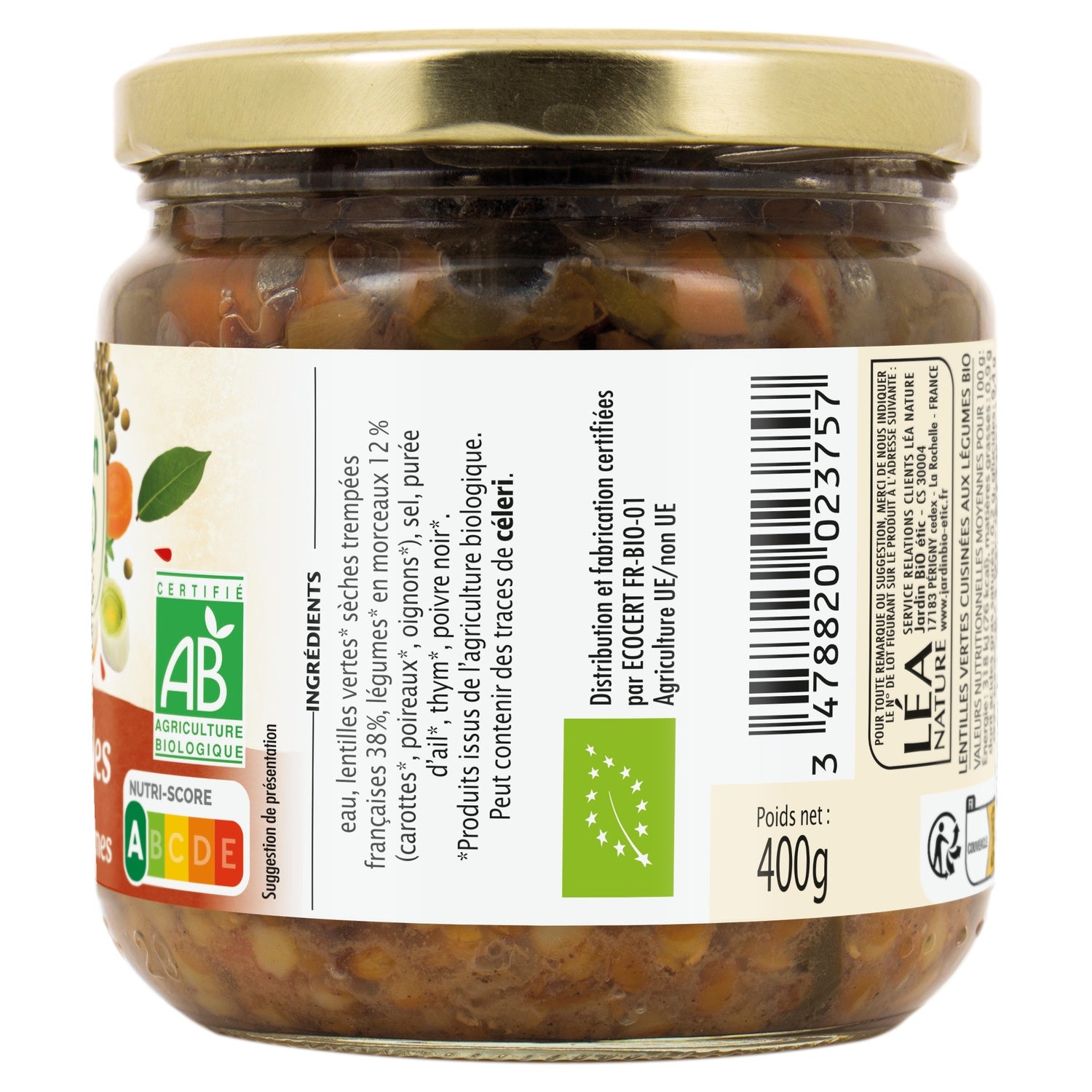 INGRÉDIENTS : eau, lentilles vertes* sèches trempées françaises 38%, légumes* en morceaux 12% (carottes*, poireaux*, oignons*), sel, purée d'ail*, thym*, poivre noir*. *Produits issus de l'agriculture biologique. Peut contenir des traces de CELERI.