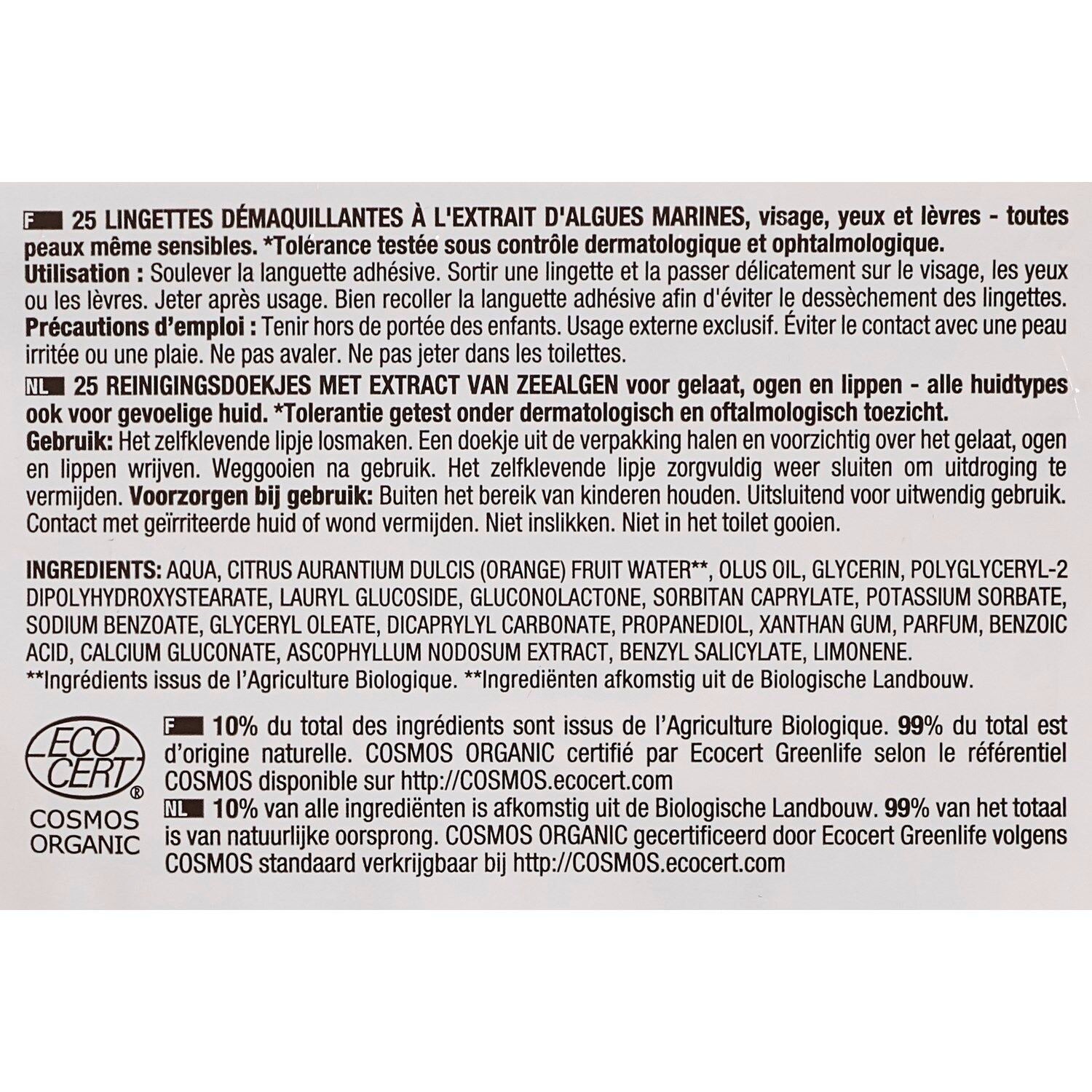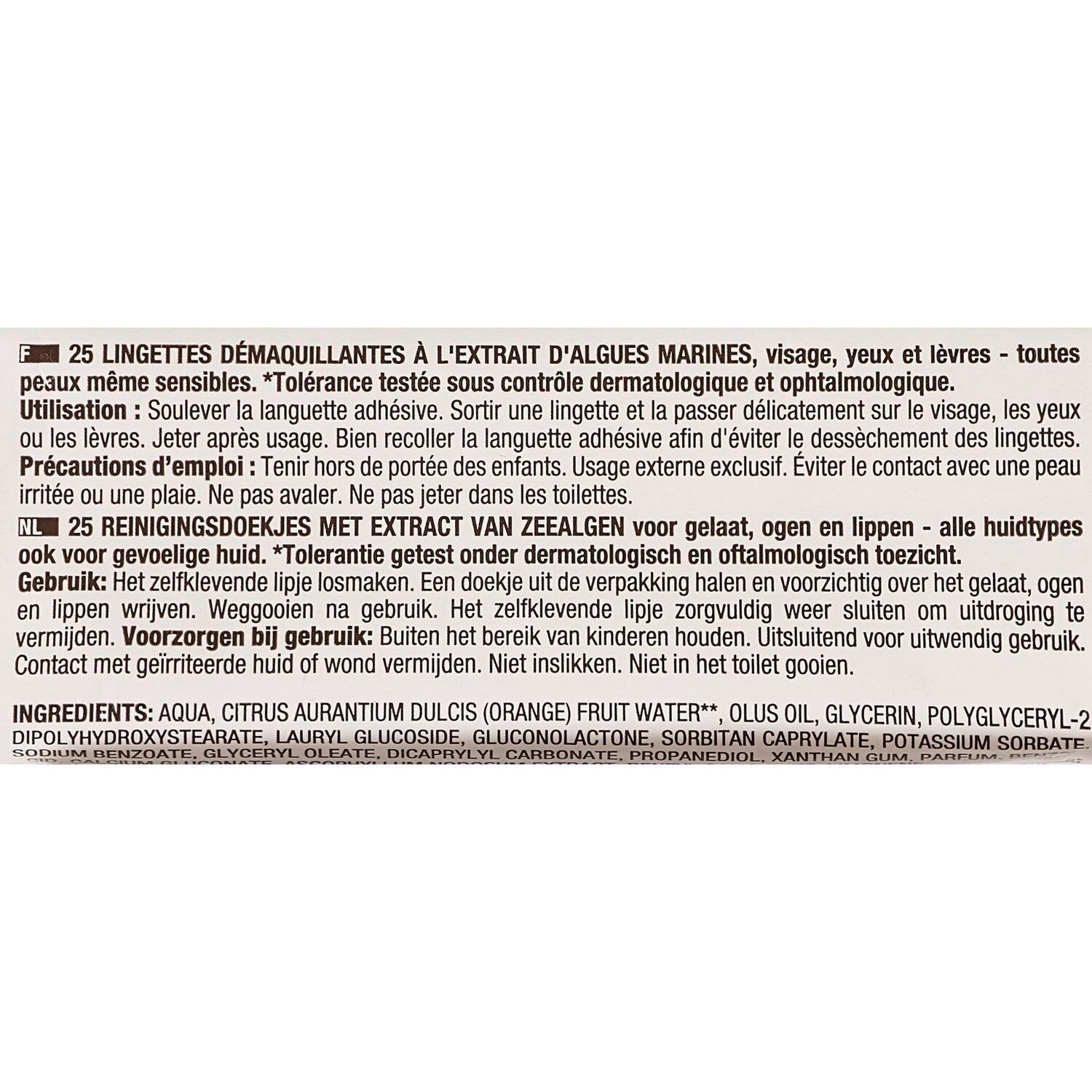 25 lingettes démaquillantes à l'extrait d'algues marines, visage, yeux et lèvres - toutes peaux même sensibles