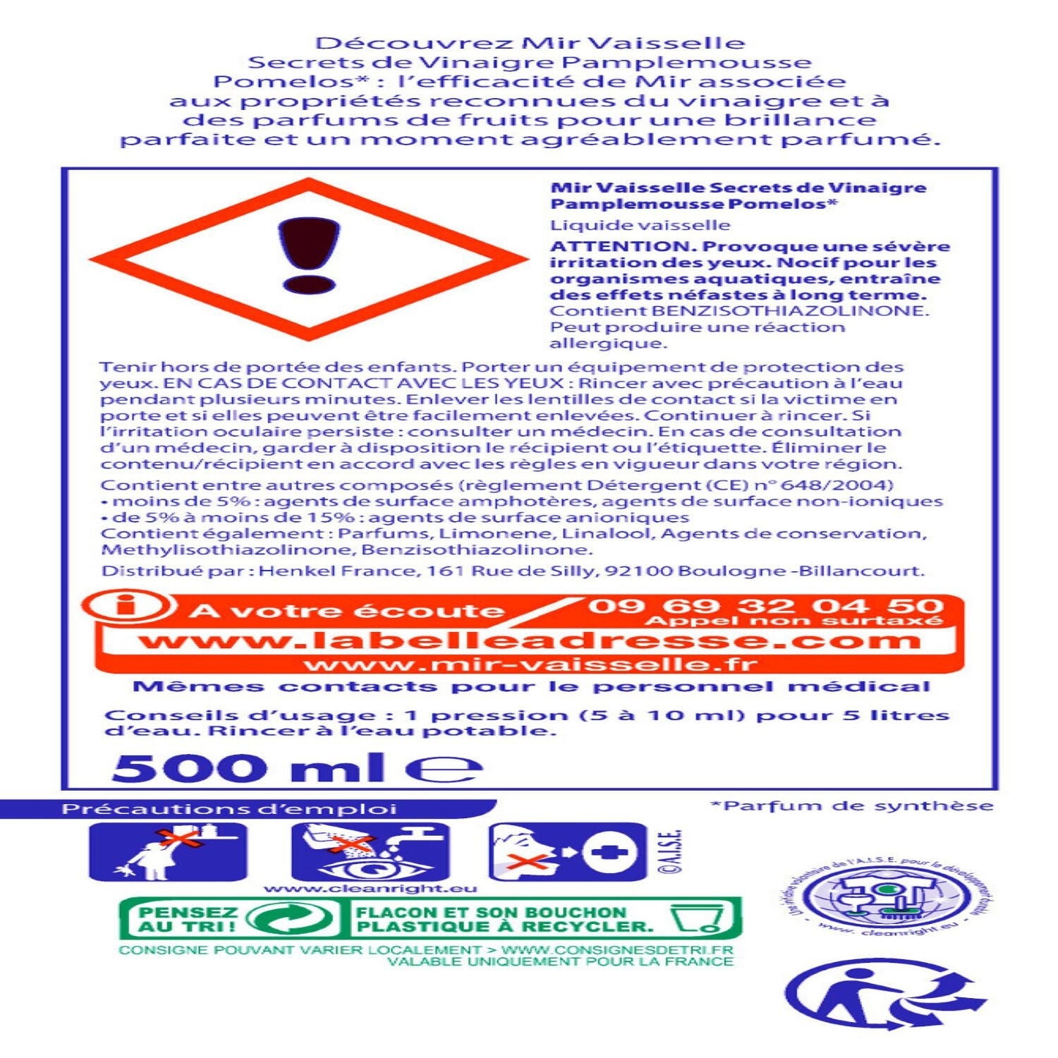 Ce liquide vaisselle assure une efficacité maximum grâce au pouvoir du vinaigre blanc : brillance et anti-calcaire Mir vaisselle est reconnue pour la super puissance traditionelle de sa gamme: nettoyant et dégraissant Mir Pamplemousse Pomelos libère un agréable parfum* de fruits Toute la gamme Mir Vaisselle est fabriquée dans des flacons en plastique 100% recyclé et recyclable