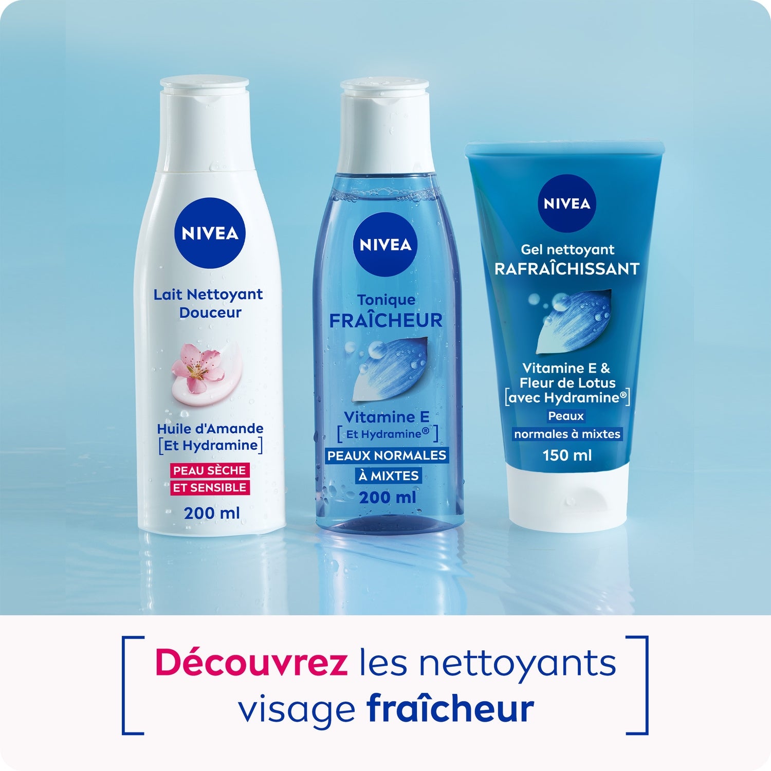 Le Tonique Fraîcheur NIVEA est enrichi en Fleurs de Lotus & Hydramine®, connue pour aider à maintenir efficacement l'hydratation de la peau. Sa formule également de Vitamine E participe également au renouvellement de la peau. Le Tonique Fraîcheur tonifie en douceur sans dessécher la peau et élimine les résidus, tout en affinant le grain de peau. Il hydrate intensément et offre à la peau une sensation de fraîcheur. Testé sous contrôle dermatologique, il est adapté aux peaux normales à mixtes. Sa formule est vegan. Démaquiller et nettoyer le visage. Imbiber un coton du Tonique Fraîcheur NIVEA et l'appliquer au visage en évitant le contour des yeux.