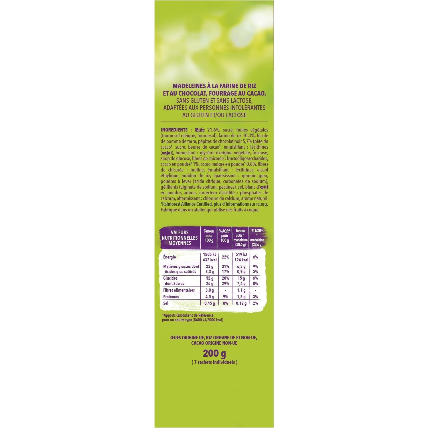 OEUFS 21,6%, sucre, huiles végétales (tournesol oléique, tournesol), farine de riz 10.3%, fécule de pomme de terre, pépites de chocolat noir 5,7% (pâte de cacao1, sucre, beurre de cacao1, émulsifiant : lécithines (SOJA)), humectant : glycérol d'origine végétale, fructose, sirop de glucose, fibres de chicorée : fructooligosaccharides, cacao1 en poudre 1%, cacao1 maigre en poudre 0,8%, fibres de chicorée : inuline, émulsifiant : lécithines, alcool éthylique, amidon de riz, épaississant : gomme guar, poudres à lever (acide citrique, carbonates de sodium), gélifiants (alginate de sodium, pectines), sel, blanc d'OEUF en poudre, arôme, correcteur d'acidité : phosphates de calcium, affermissant : chlorure de calcium, arôme naturel. Fabriqué dans un atelier qui utilise FRUITS A COQUE