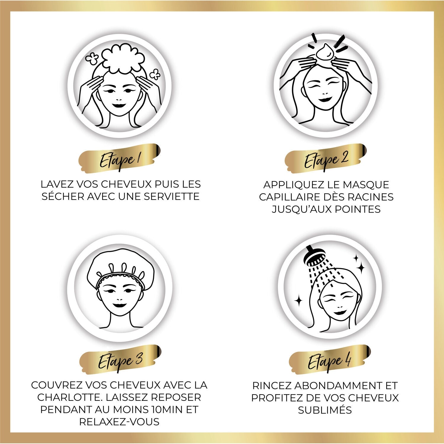 Étape 1 : Lavez-vous les cheveux et séchez-les avec une serviette.\nÉtape 2 : Appliquez le masque capillaire des longueurs aux pointes.\nÉtape 3 : Couvrez vos cheveux à l’aide de la charlotte. Laissez agir pendant au moins 10 minutes .\nÉtape 4 : Rincez-le et observez la transformation.
