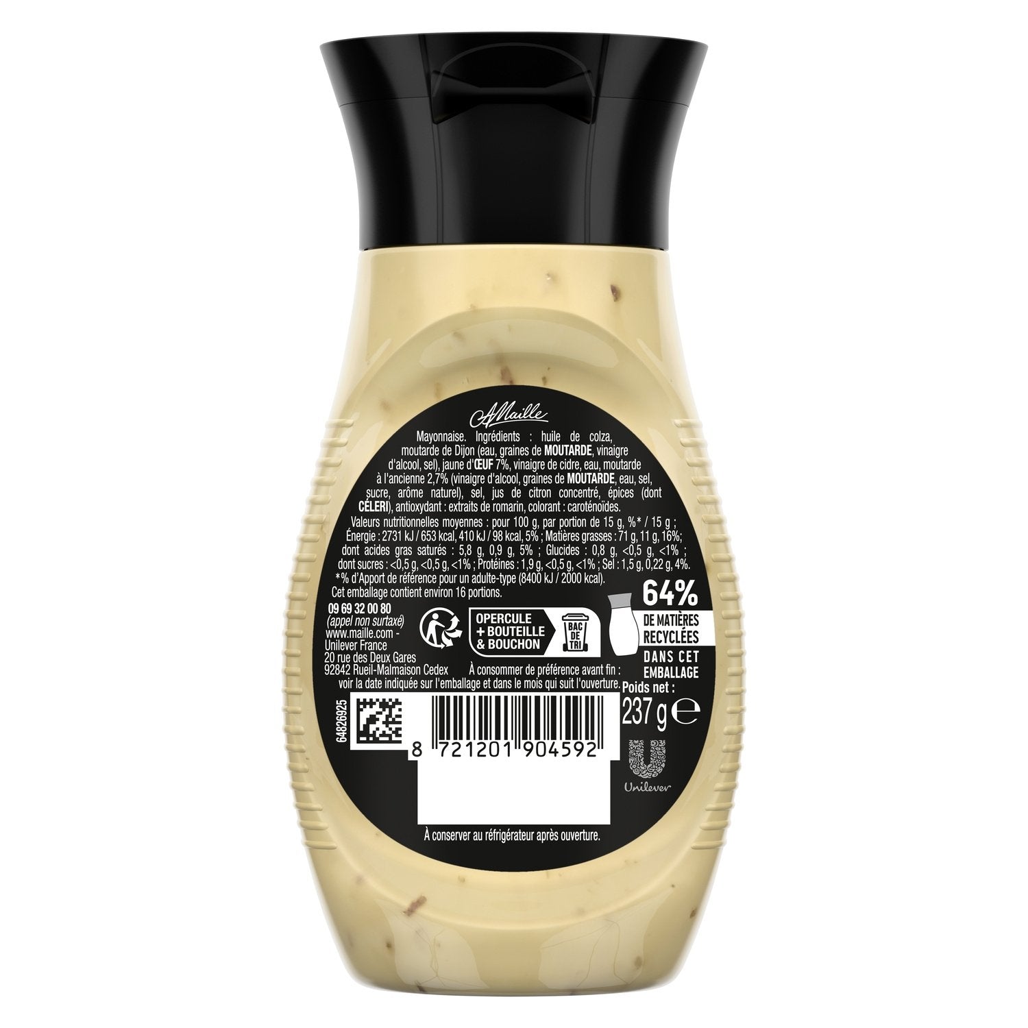 Découvrez la Mayonnaise Fins Gourmets Qualité Traiteur Maille®, une recette élaborée à partir d'ingrédients de qualité dont une pointe de Moutarde à l'Ancienne.,La mayonnaise Fin Gourmets Maille® a une texture généreuse et unique grâce à l'alliance originale de la Moutarde à l'Ancienne et de la Moutarde de Dijon.,La mayonnaise Maille ® est présentée dans un élégant flacon souple de 237 g, qui comporte au moins 64% de matières recyclées*. *Bouteille en plastique recyclée, hors bouchon, opercule et étiquettes.,Cette mayonnaise texturée et unique qualité traiteur accompagnera parfaitement vos plats quotidiens du plus simple au plus sophistiqué.,Une recette de mayonnaise raffinée idéale pour accompagner généreusement vos créations comme un sandwich gourmet poulet avocat, une tartine façon œuf mimosa ou un lobster roll.,Cette mayonnaise est à conserver au réfrigérateur après ouverture et à consommer dans le mois qui suit l'ouverture.