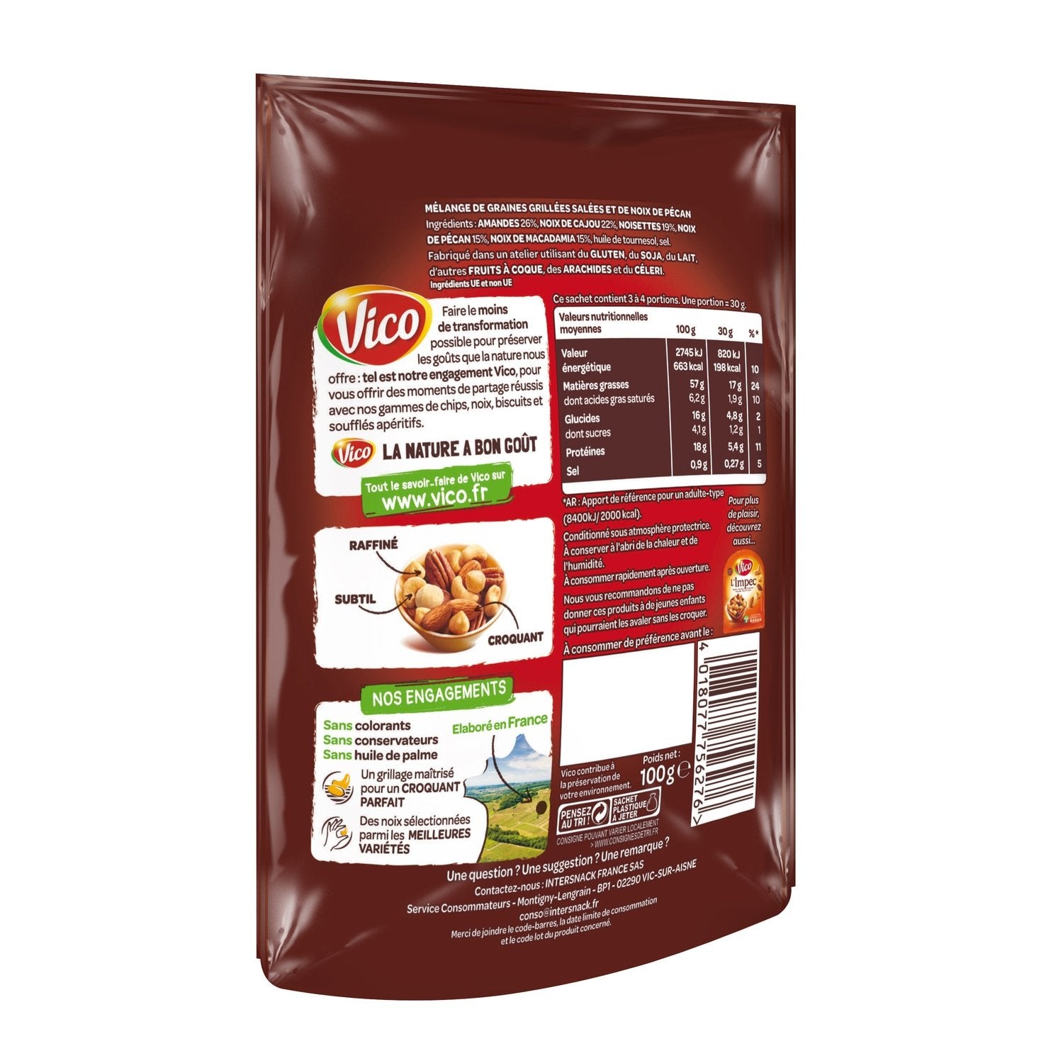 AMANDES 26%, NOIX DE CAJOU 22%, NOISETTES 19%, NOIX DE PÉCAN 15%, NOIX DE MACADAMIA 15%, huile de tournesol, sel.