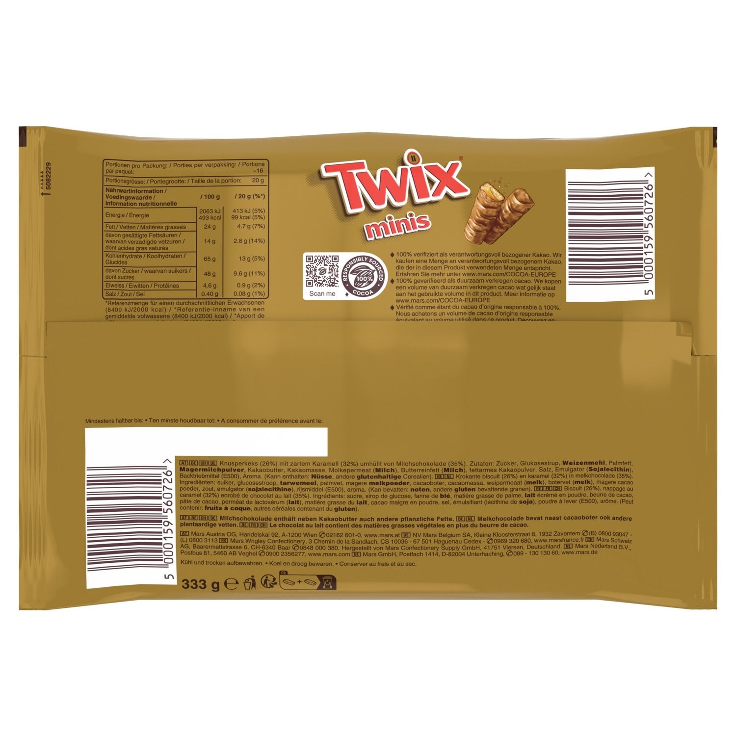 DétailsTWIX® minis 333g, carton de 24 Poids unitaire : 200 grs Code-barres EAN : 5000159560726 Marque : TWIX